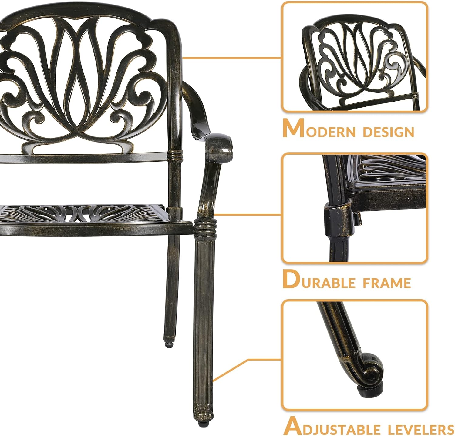 - 【Considerate Design】 - Each leg of this patio chair is equipped with adjustable levelers for non-flat surface. The curved backrest of the chair fits your back, wide seats allow you to sit comfortably, curved armrests allow you to place your arms naturally to get rid of the fatigue of the day and make your leisure time more enjoyable.