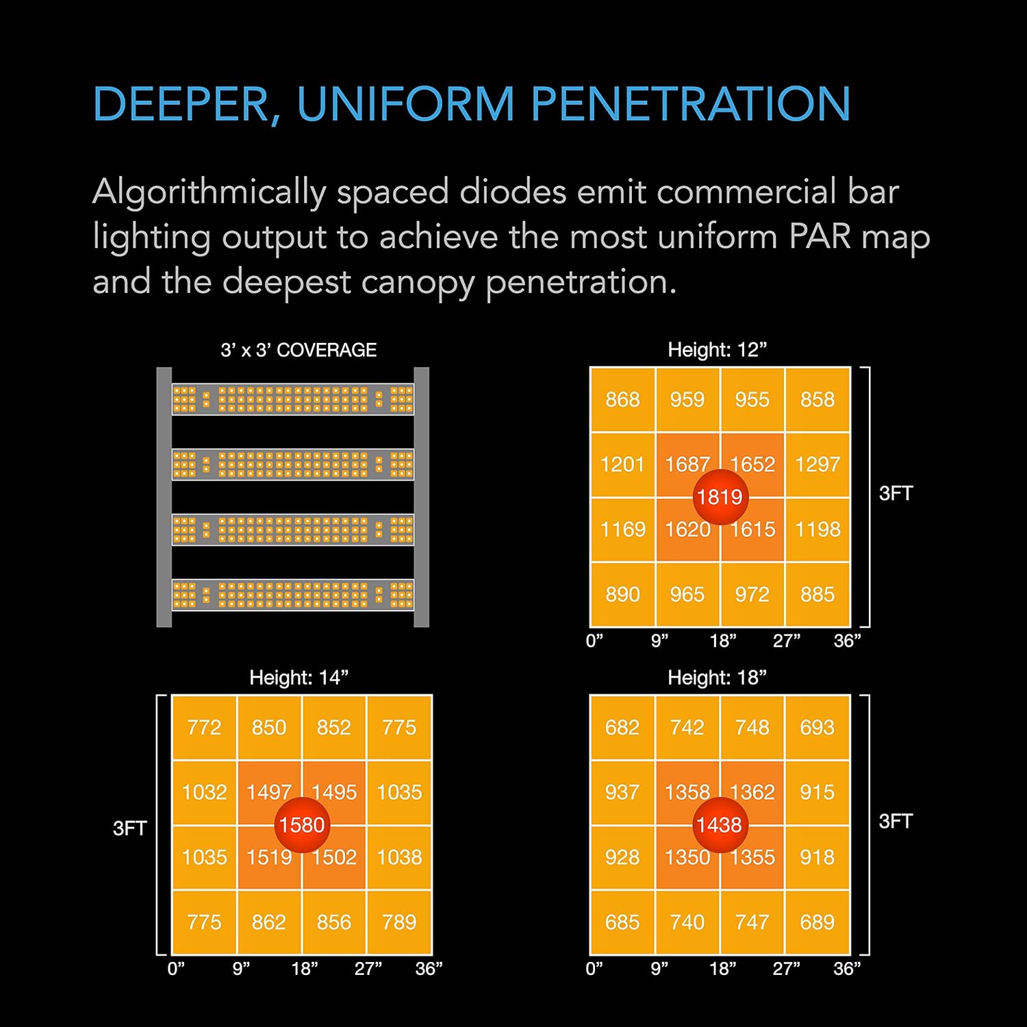 - Bar-style fixture with algorithmically spaced diodes optimized for even coverage, deep canopy penetration, and hotspot reduction.