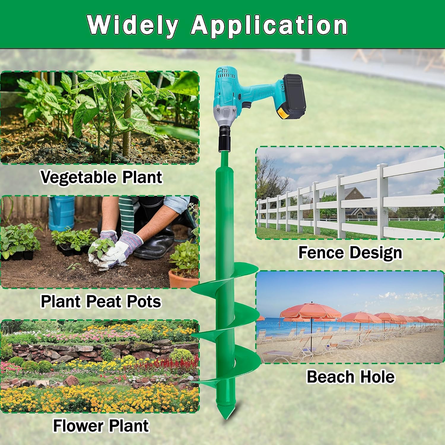 - đ±ăWidely UseăThis auger drilling bit is not only widely used for planting bulbs, potted plants, vegetables, flowers, bare-root trees, shrubs, etc., but also can be used for fixing fences, beach umbrellas, hole building tents, etc.