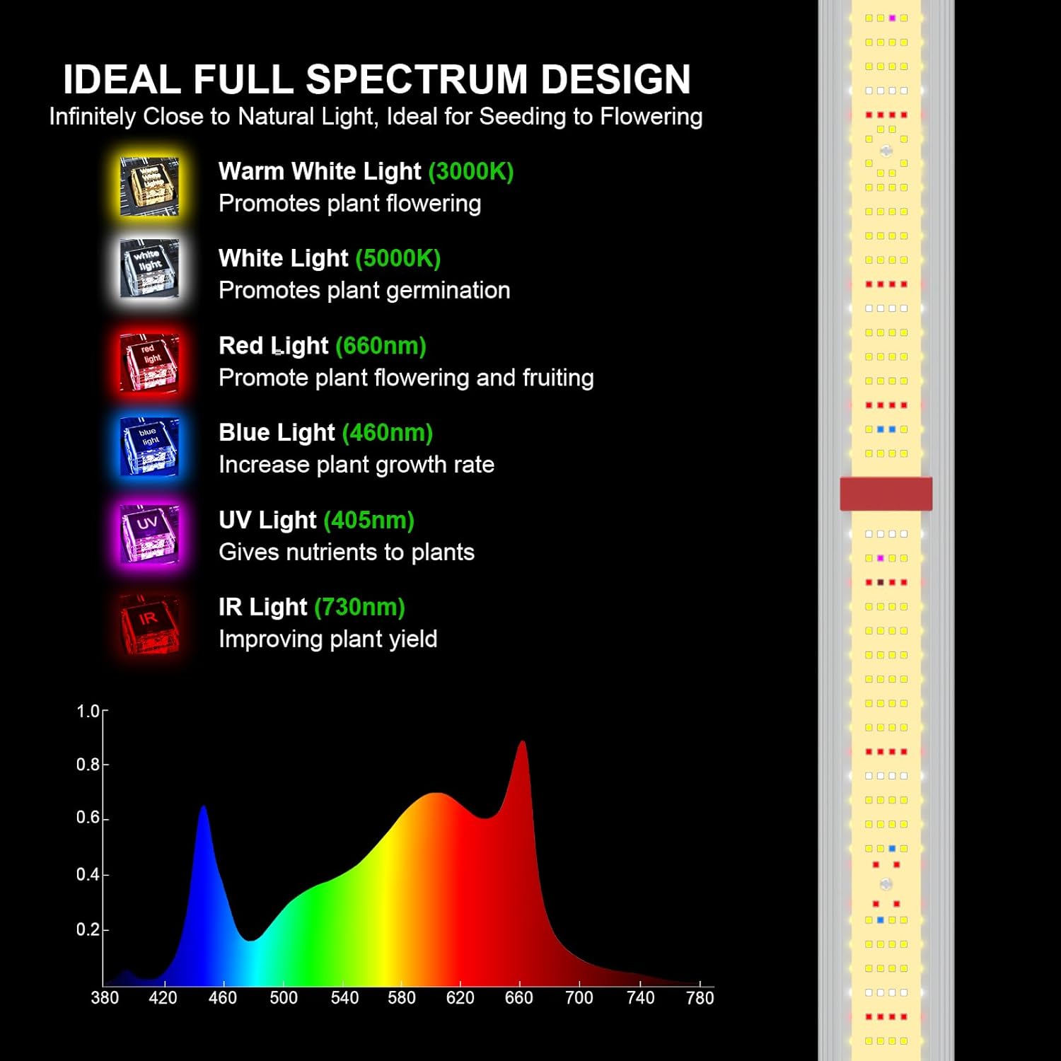 - IDEAL FULL SPECTRUM & DIMMING - AGLEX 1000W led grow light consists of full spectrum Warm White3000K, Cool White 5000K, Blue 460nm, Red 660nm, UV 405nm and IR 730nm, is infinitely close to natural sun light, perfect for seeding to flowering, applied to the whole stages of indoor growing plant. Growing lamp 1000w comes with flexible dimmable function, 4-level dimming knob from 0-100% available, convenient to adjust the brightness according to the plants at different growing stages.