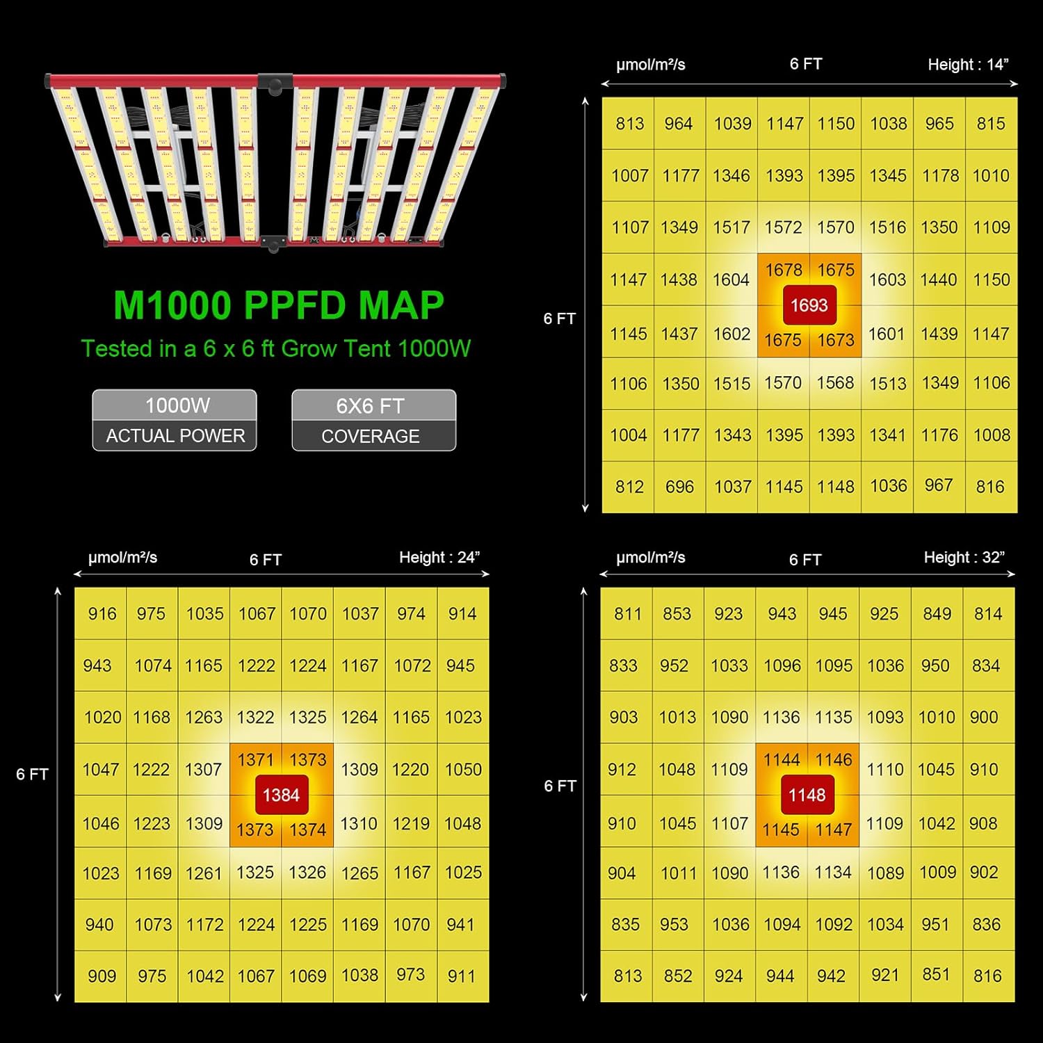 - MAXIMIZE YIELDS & CROP QUALITY - AGLEX M1000 led plant growing light is with 3400PCS high efficient chips, only consumes 1000w with 3400 leds, achieving higher average PPFD with 1693muol/㎡/s at 6x6ft core coverage. The average yield is more than 2.8g per wattage. The 1000w led bar grow light can help you achieve maximum quality and quantity. Wide Input Voltage 100-277V, can meet most input voltage.