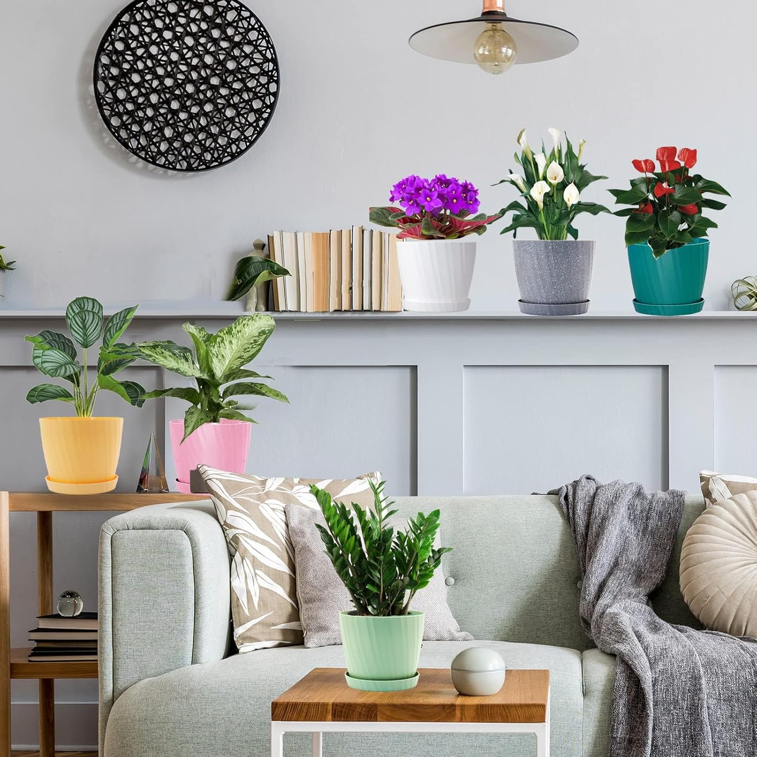 7 Inch Plant Pots Bulk, 6 Pack Plastic Planters with Drainage Holes and Saucers for Indoor Outdoor House Plants and Flowers, Colorful