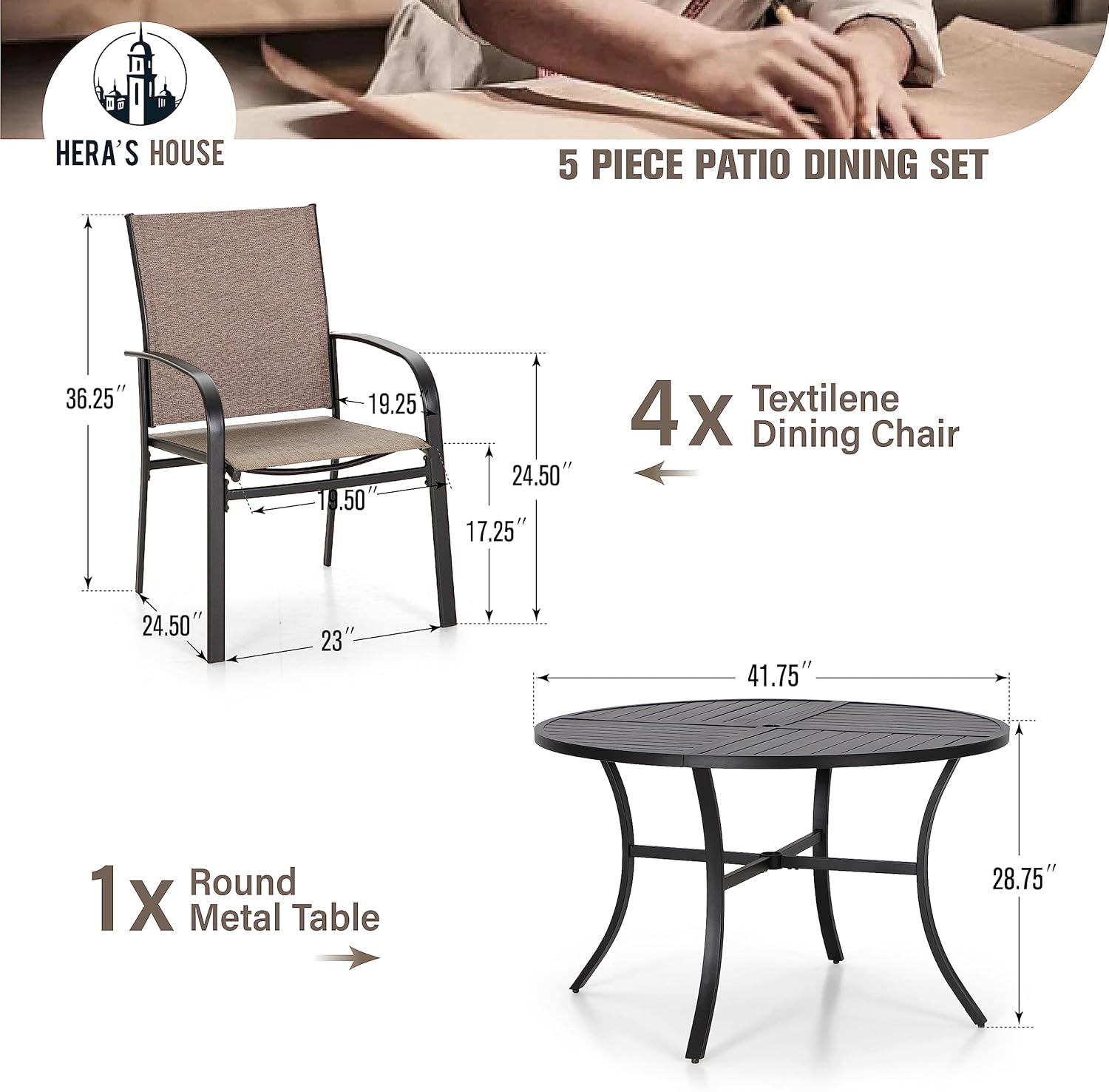 - 【A REAL PRACTICAL PATIO DINING SET】This dining set including 1 x patio table, 4 x patio dining chairs. Perfectly fitting with your backyard, poolside, balcony, garden and deck to create an outdoor comfort zone. Perfectly meet the requirement of enjoying outdoor leisure time like a meal or host a party with your family or friends.