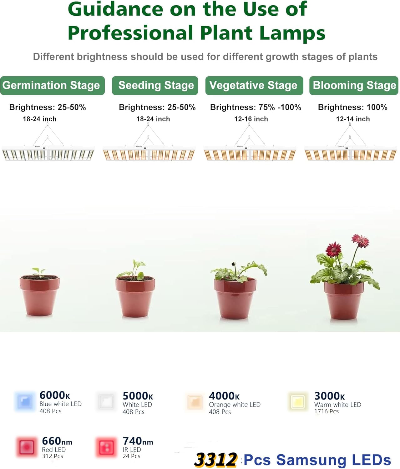 - Dimmer & Timer Functions: Our grow lights consist of 660nm Red light, IR 740nm, and 6000K, 5000K, 4000K, 3000K white light spectrum. The panel dimmers can adjust the intensity of the light, and the growing lamps support timer setting and time reservation function. This helps plants grow healthier. Perfect for 6x6 ft, with max coverage of 6x6 ft.