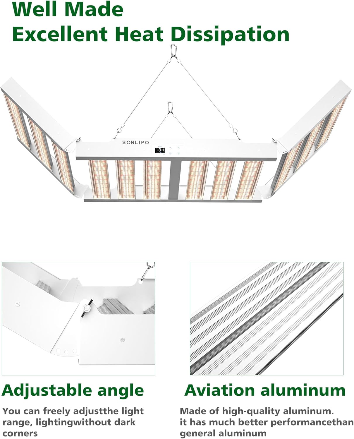 - Professional 3-Stage Full Spectrum: Sonlipo plant light is designed with 3 types of Sunlike full spectrum to meet the different growth stages of plants, including Seeding, Vegetative, and Flowering & Fruiting stages. This increases plant yield to a maximum of 2.9 g/w. The 3 full spectrum modes are controlled by a panel (VEG, V&B, BLOOM), making it easy to use and adjust.