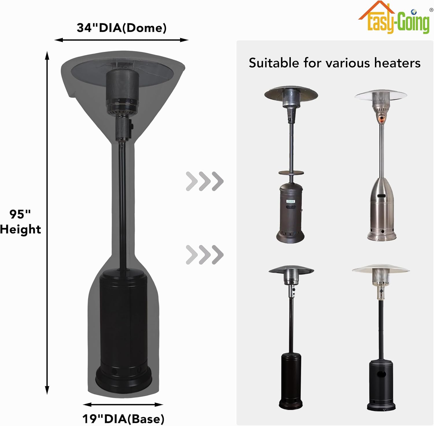 - Item Dimension: The heater cover size is 95"H x 34"DIA(Dome) x 19DIA(Base). It fits most pro-pane patio heaters. Please measure your patio heater before purchasing.