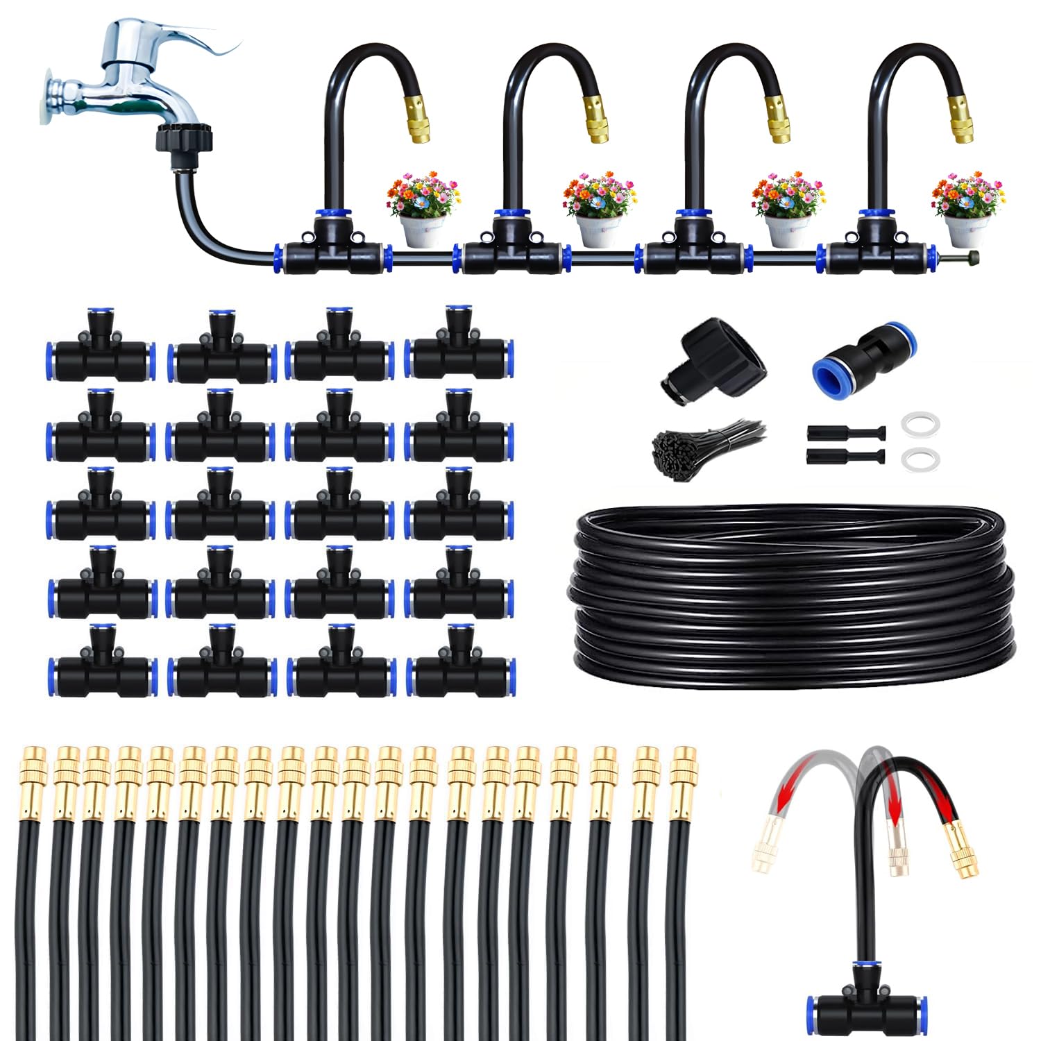 - 【Garden Irrigation System】Drip irrigation system including 65Ft hose, 20pcs 360° Misting nozzles, 20pcs T-joints(12mm-8mm-12mm), 1pcs Straight connector(12mm-12mm), 1pcs Faucet adapter(12mm), 2pcs End plug, 2pcs Adapter washer and a bundle of cable ties. Everything you need is included in this garden misting watering system.