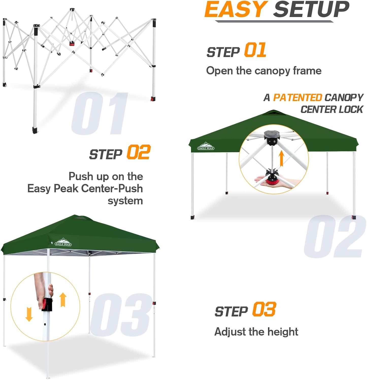 - EASY SETUP: This easy setup pop up canopy tent features the Peak Push system, a patented canopy center lock. The portable canopy requires no tools and easily opens and closes from the center in seconds. Its unique canopy tent center lock enables a quick, one person setup, letting you maximize outdoor time with minimal effort