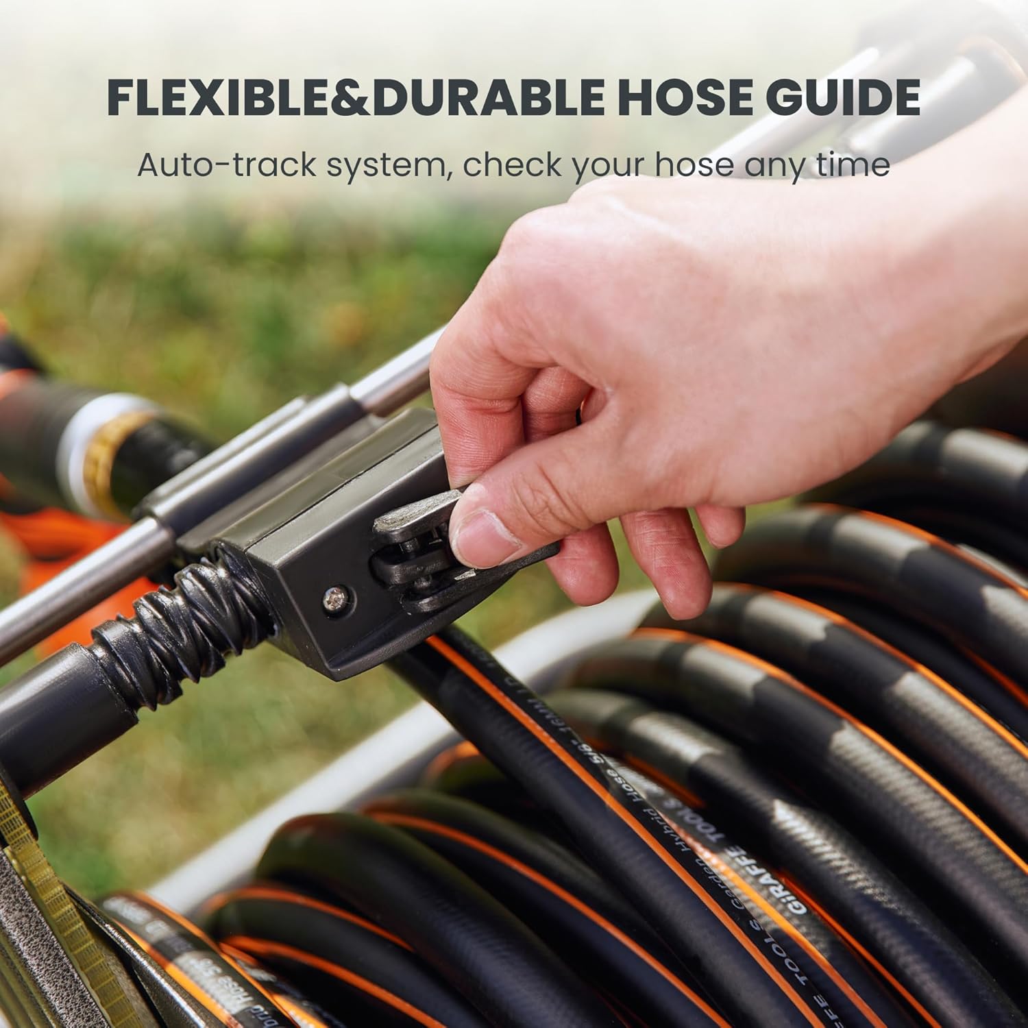 - Hose Guide System: Reinforced axis and convenient hose guide system allows you to roll up the garden hoses neatly without effort. All you need to do is wind the non-slip handle. Get free from annoying and dirty hand-held way of winding up hoses.