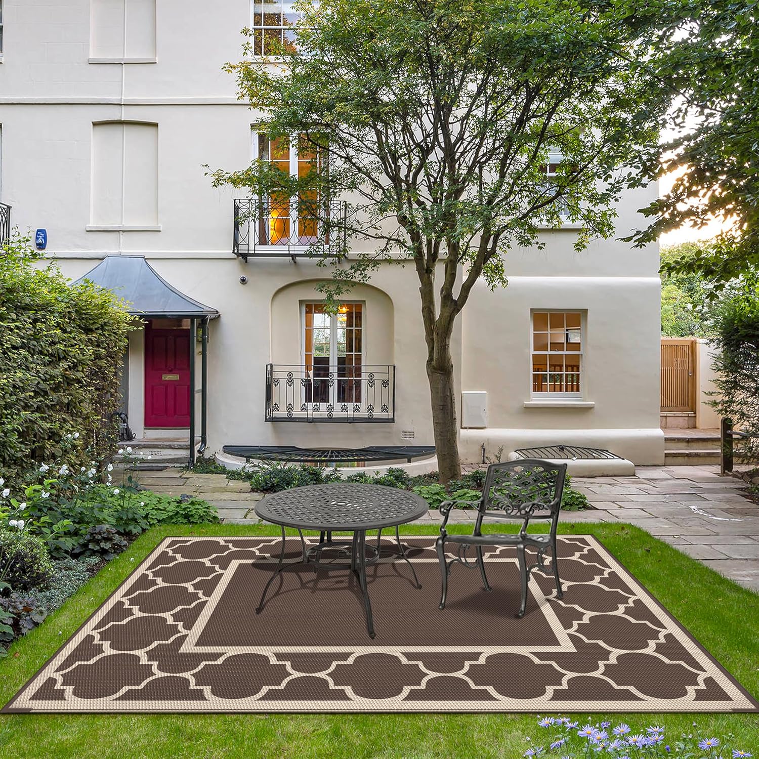 GENIMO Outdoor Rug 8' x 10' Patio Waterproof, Foldable Reversible Plastic Straw Area Rugs Mat for Camper Decor, Outside Carpet for Rv, Deck, Porch, Picnic, Beach, Balcony, Coffee & Beige