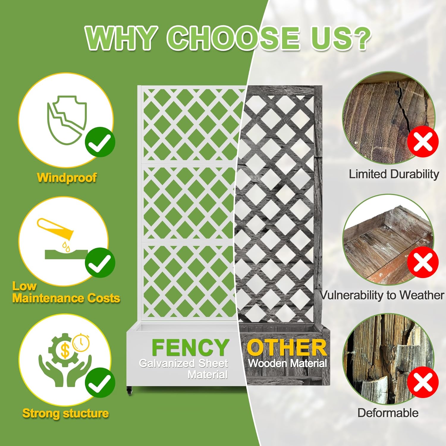 FENCY Metal Planter Box with Diamond Lattice Trellis Planter Box for Climbing Plants/Vines, Galvanized Raised Garden Bed On Wheels, Garden Bed with Trellis(73"x35" White)