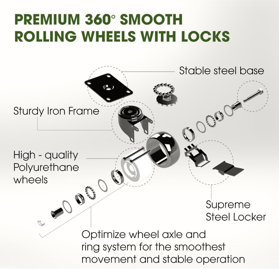 - UNIQUE 360 DEGREES ROLLING WHEELS WITH LOCKS: Equipped with durable 360-degree rotating Polyurethane wheels, our plant caddy glides smoothly on any surface, from carpet to soil; The locking mechanism ensures your pots for plants stay securely in place