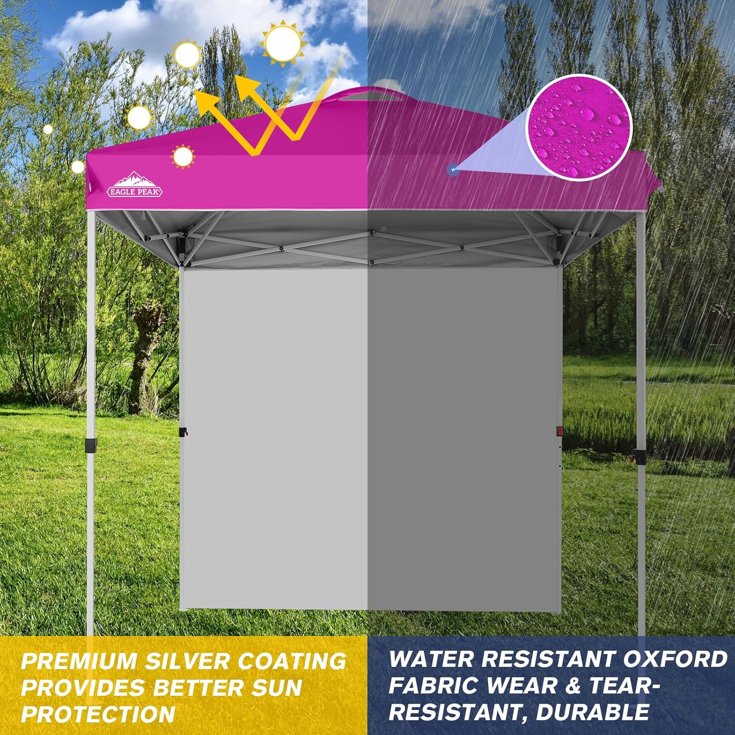 - DURABLE & SPACIOUS: This EAGLE PEAK event canopy provides shade for 3-6 people. Adjust the peak height easily with the pinch free leg release. Built with a powder coated steel frame and hardened through bolts, it ensures lasting durability. The coating resists rust and corrosion, making it an ideal event shelter for farmers' markets, the beach, parties, festivals, and sports events.