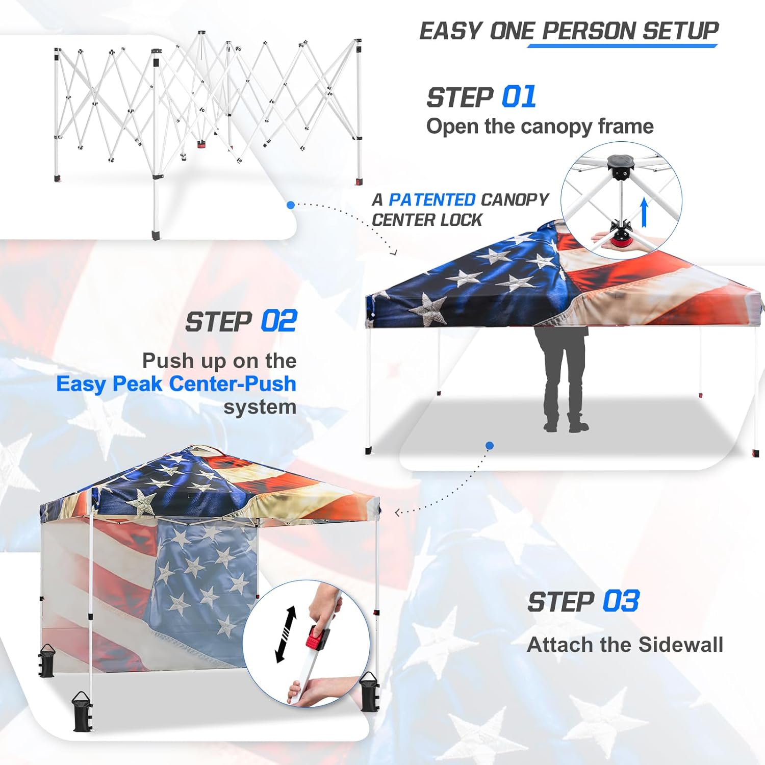 EAGLE PEAK Pop Up Canopy Tent with 1 Sidewall, Easy Setup Event Tent, Outdoor Sun Shade, Wheeled Carry Bag, Stakes and Guy Ropes, Instant Canopy 10x10, Stars and Stripes