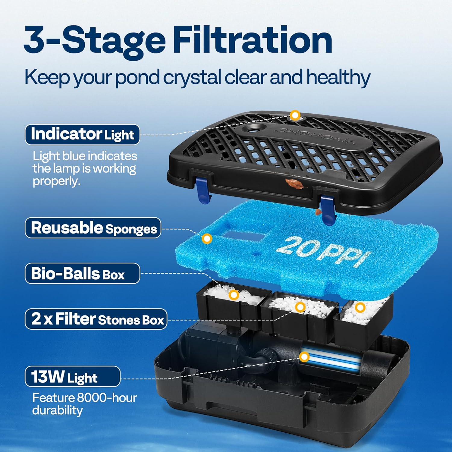 - MULTIPLE FILTRATION SYSTEM: The combination of 20 PPI filter sponges, filter stones and bio balls creates a professional filtration system that effectively purifies water, keeping a clean pond for you; A built-in 13W lamp with 8000-hour life ratings further improves water clarity and quality, with the visible window to observe the the working condition of the lamp; Built-in independent filter material box for easy, replacement and adding different filter materials