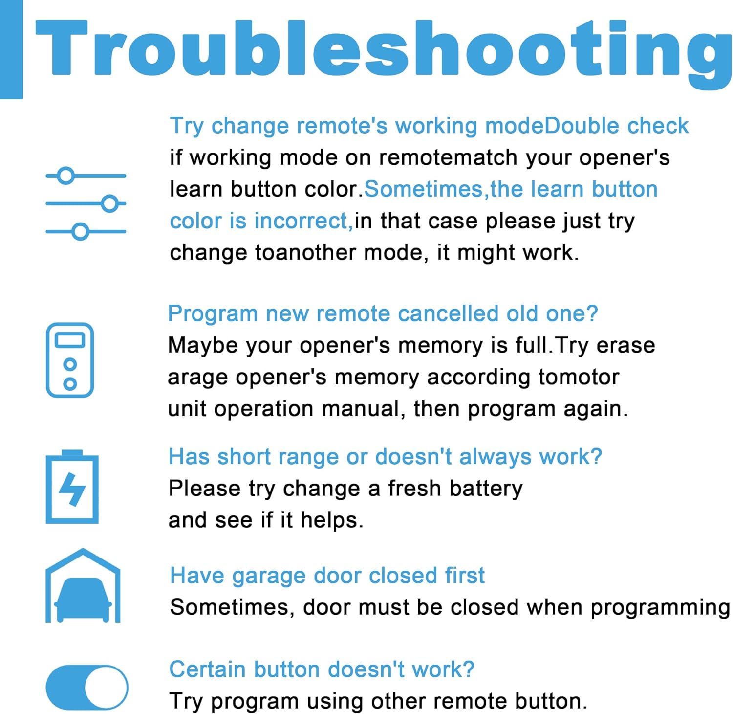 - Enhanced Security - Our garage door opener keypad remote feature the latest Billion Code/Security+/Security+ 2.0 Rolling Code technology to minimize radio wave interference, and the Garages door Keypad Opener supports three channels to control up to three garage door opener. 2-Button key fob Garage Door Opener Remote Supports Two Channels to Control Up to Two Garages door opener