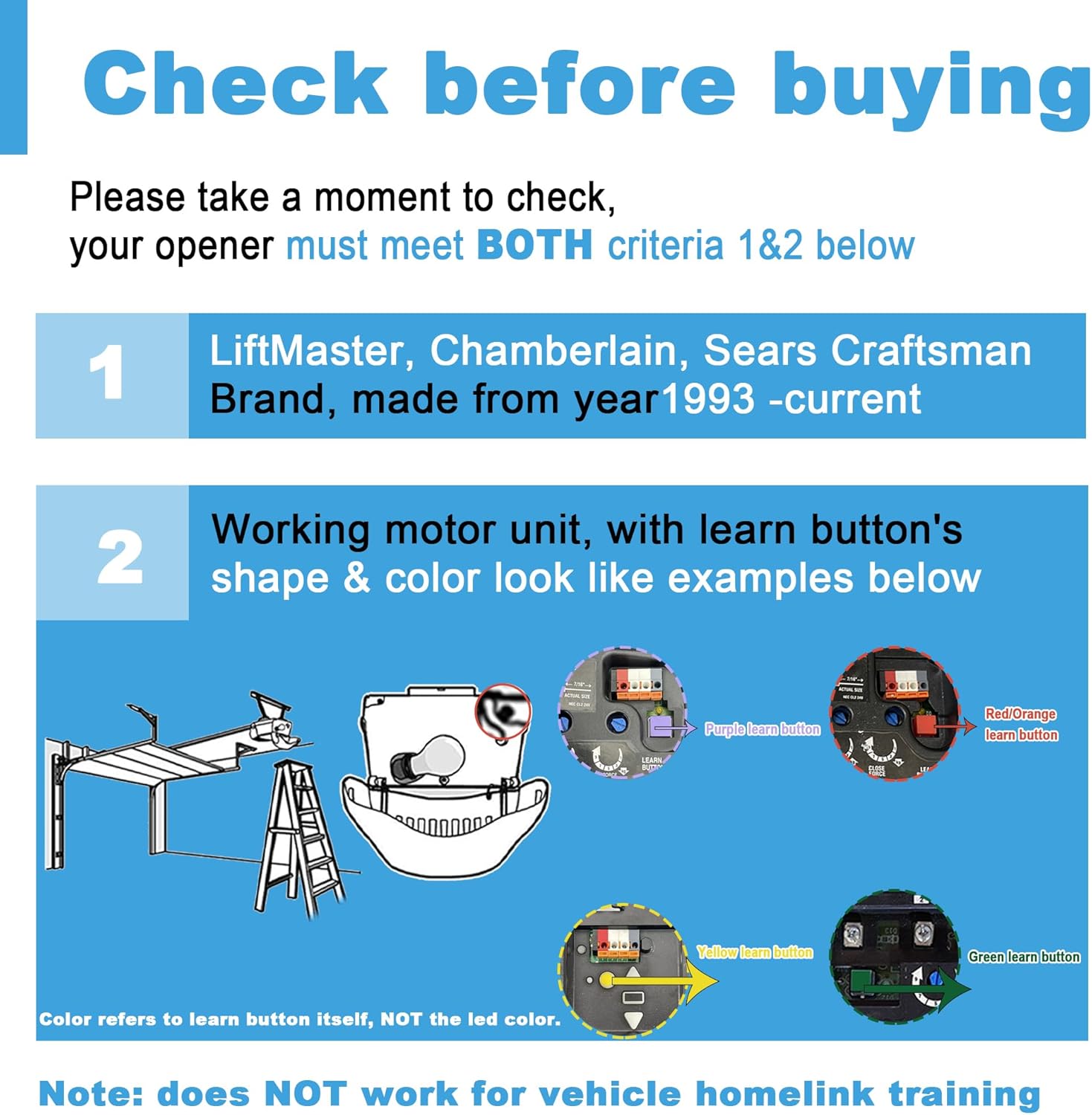 - UNIVERSAL COMPATIBILITY: The 893MAX Garage Door Opener Remote and the 877MAX Garage Door Keypad Opener are compatible with Lift master Chamberlain and Sears Craftsman garage door opener manufactured after 1993, make sure that your garage door opener has Red/Orange Learn Button ( 390 MHz Security+) Green Learn Button (390 MHz Billion Code) Purple Learn Button (315 MHz Security+) Yellow Learn Button (Security + 2.0) .Does not work with Craftsman 200.57933, 57943, 57953 series and 100 CR1150, 139.57943, 139.57953 models