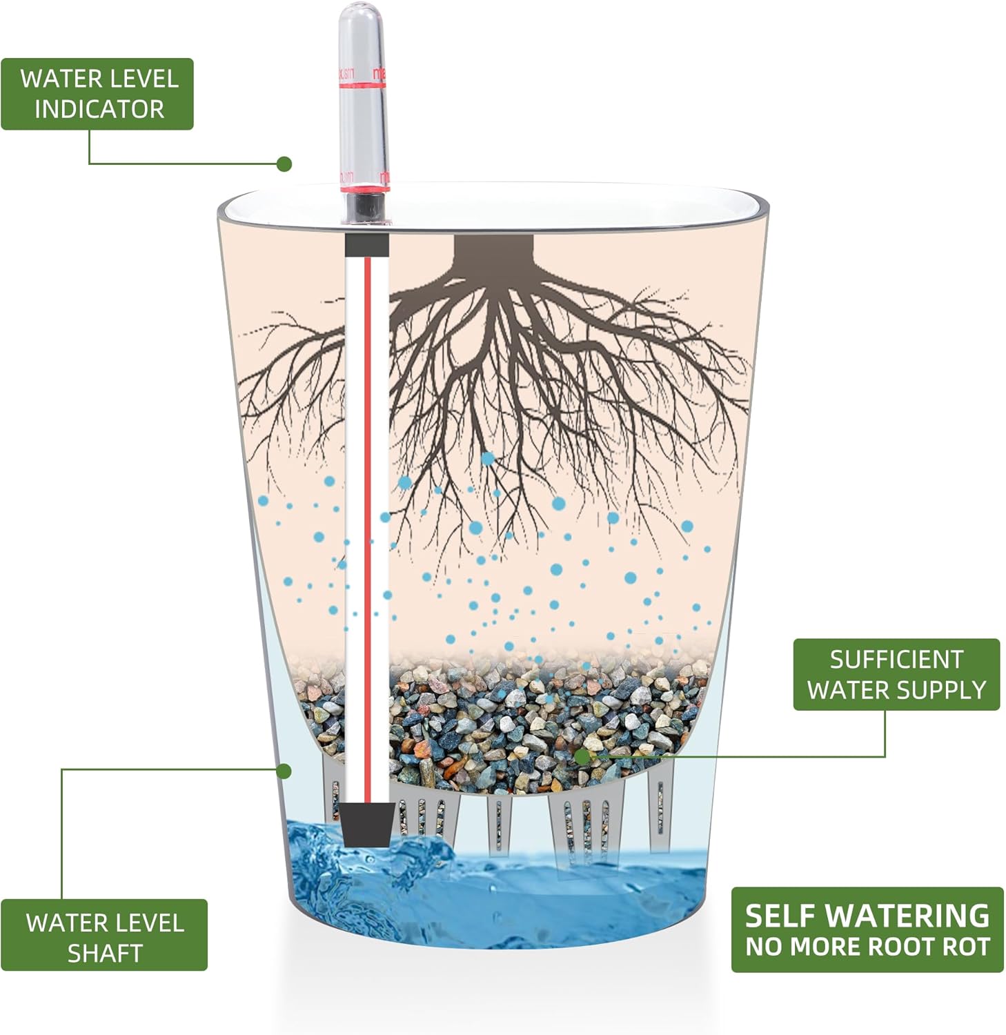 - NEVER MISS WATERING AGAIN - The hydroponic device keeps water ready, then watering time is at your discretion on the gauge. The design of drainage plug and spillway hole is to avoid cycles of overwatering and underwatering, pull out the plug to drain the excess water on rainy days outdoors. The sufficient water supply system enables double the water-efficient than conventional pots. Don't be anxious about missing watering while you enjoy a long term holiday on a journey or travel outside