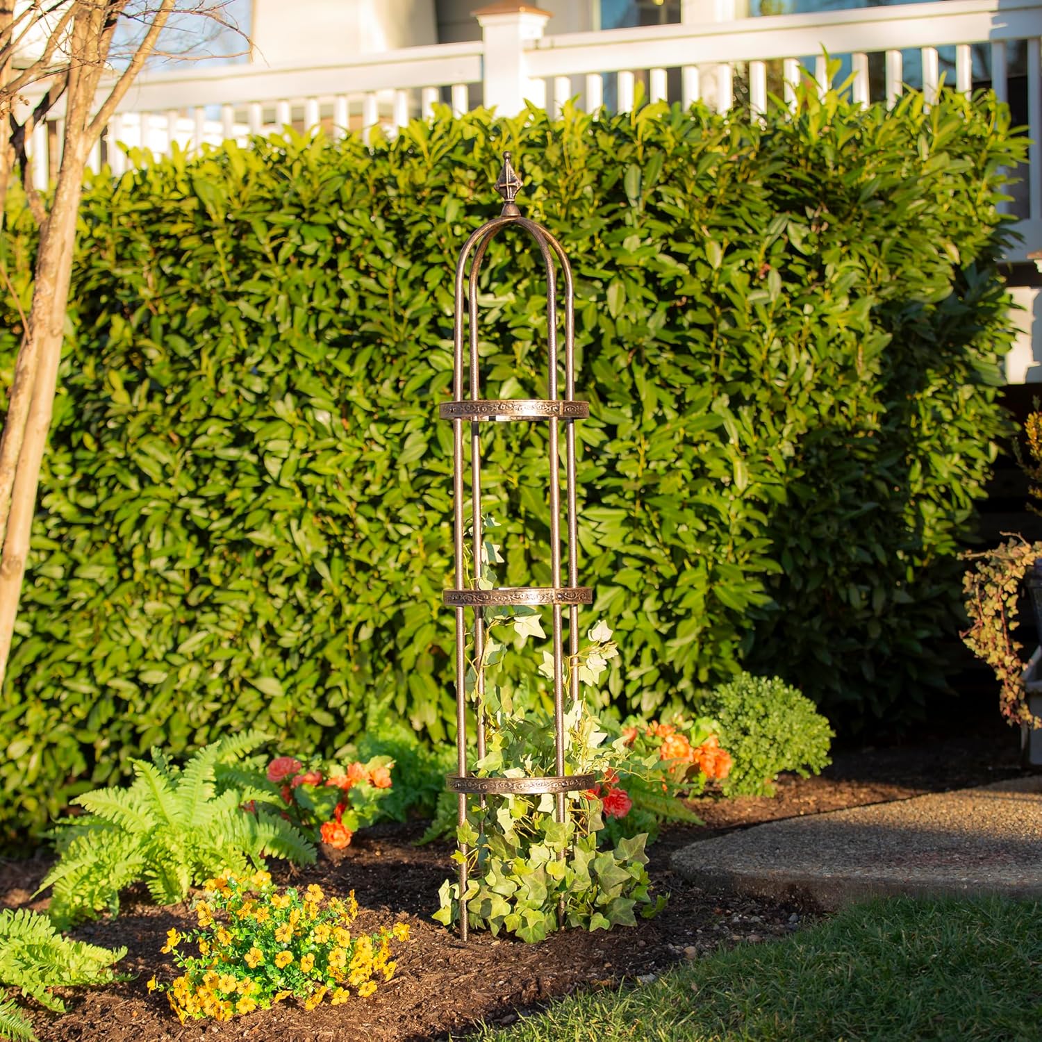 - GORGEOUS GARDEN OBELISK TRELLIS: Elevate your garden's aesthetic with our powder-coated steel garden obelisk. It is the perfect plant trellis for climbing plants like roses, ivy, or jasmine. This weatherproof and waterproof trellis resists rust, perfect for year-round garden trellis use. Whether in your garden, patio, or a planter, its delicate floral patterned support bands and classic cast iron finial add an English garden charm, serving as a stunning garden arch trellis and a decorative focal