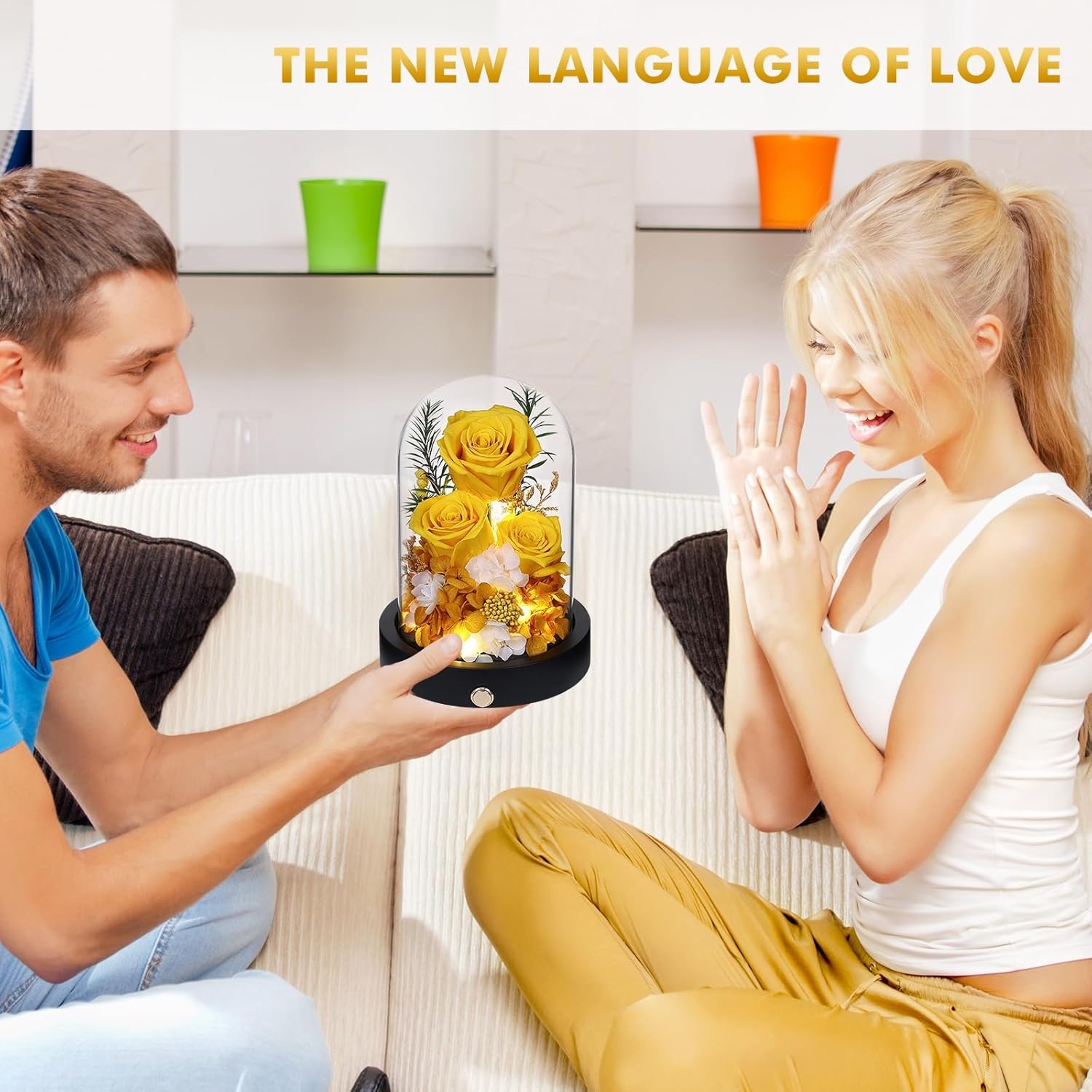 Flowers for Delivery, 3 Yellow Forever Roses in Glass Dome with LED, Preserved Real Rose, Valentines Day Anniversary Birthday Mothers Day Flower Gifts for Mom Her Women Wife Mother