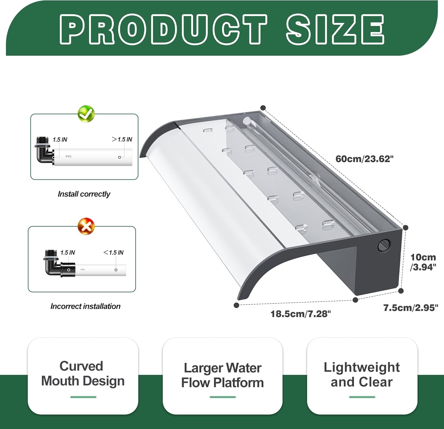 - ăUpdated Curved Open Lipă- Unlike other narrow, short waterfalls, our updated pond waterfall features an integrated 8-inch wide water platform and 4-inch high water storage tank platform, and curved open lip. This wider, longer design creates a stable, smooth stunning water flow, so you can better enjoy the soothing sights and sounds of the cascading water. Waterfall does not include LED lights. Purchase them in our store.
