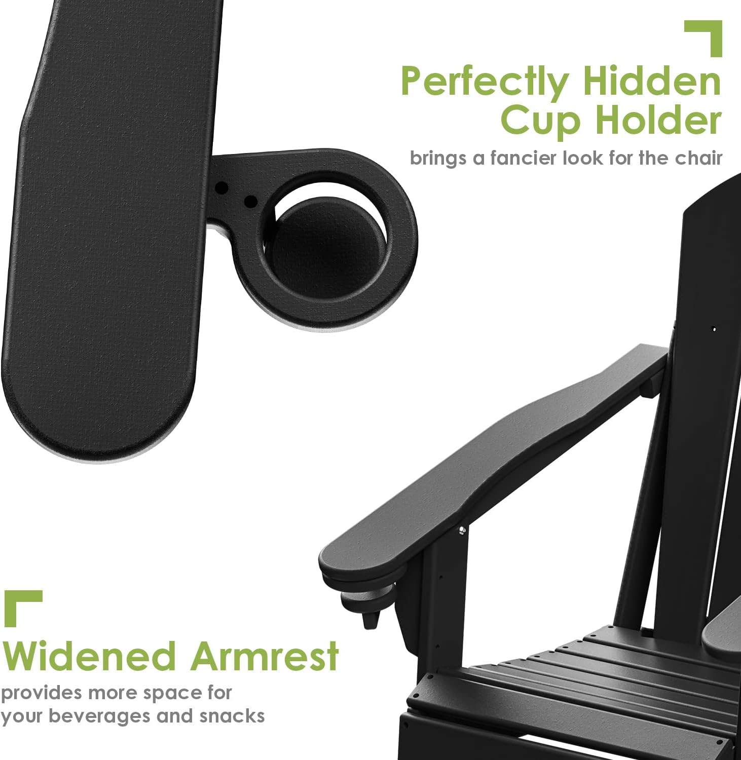 - 【Ergonomic & Foldable】 GreenVines Folding Adirondack chair features a hidden cup holder in the right arm, offering ample space for drinks or media devices. The reclined legs are designed for stability without the need for pins or chains. Easily foldable, this chair is perfect for storage at home or for taking on road trips. The slatted seating ensures quick drying after rain, while trimmed edges enhance safety for you and your family