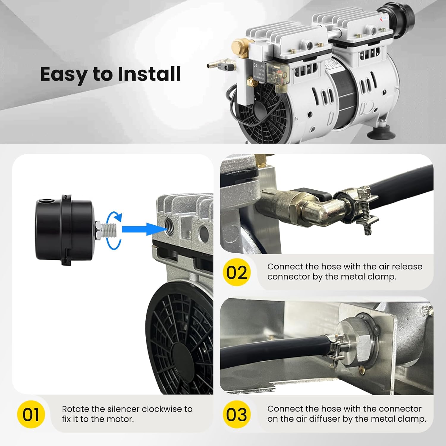 - Easy Installation — With the foot pads and silencer installed already, just connecting the air hose with the air-release connector on the air compressor by a metal clamp and connecting the air hose with the connector on the air diffuser via a metal clamp, plug the power cord to the socket and turn on the switch on the electrical box, the pond aerator for outdoor ponds could start to work