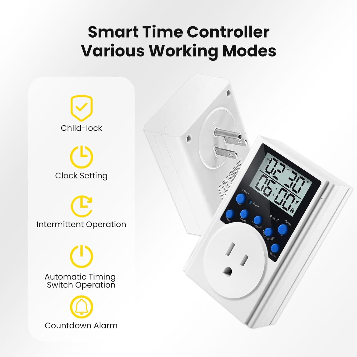 - Multiple Working Modes — Various timing functions could be set for energy efficient via the smart time controller such as automatic timing switch operation, countdown timer alarm, intermittent duty for the pond air pump aerator outdoor. The pond air pump could keep working without using the timer controller by manually turning on the switch after power on