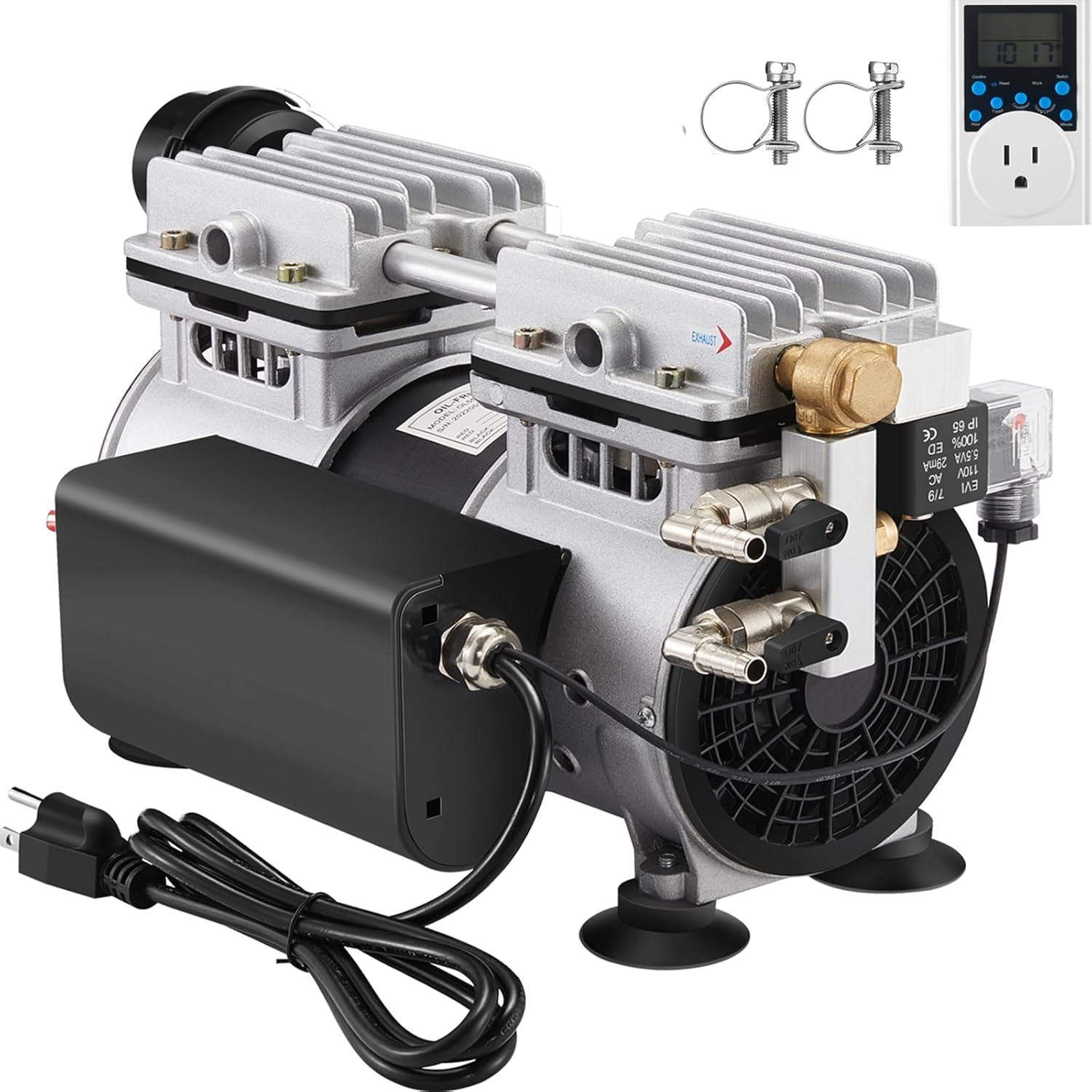 - 3/4 HP Air Compressor — Highly efficient and quiet 3/4 HP oil-free Rocking Piston Air Pump, with maximum 5.2 CFM air volume and below 60DB low noise level, strong power to promote the underwater oxygen circulation