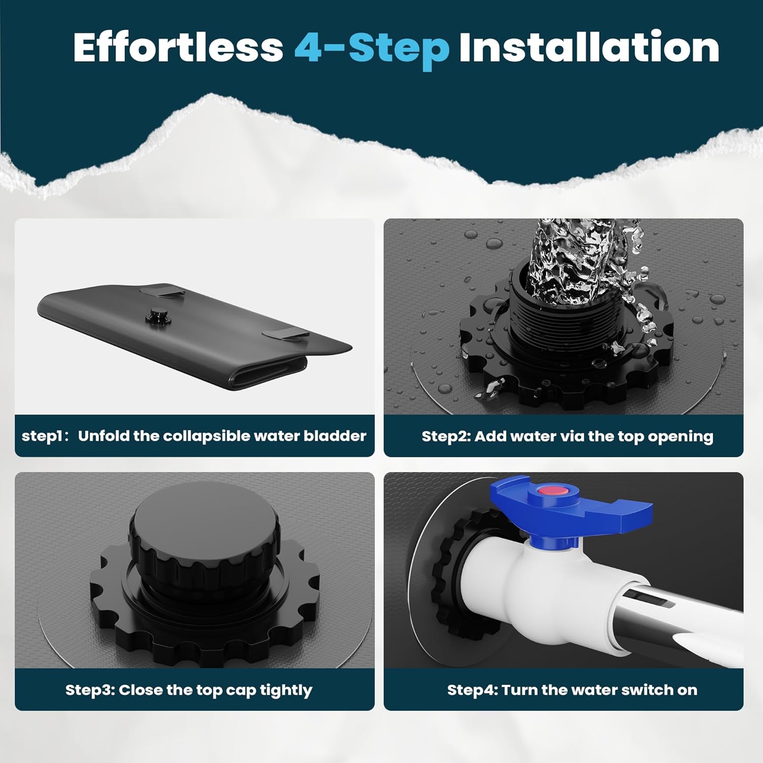 - đ§ăHigh-quality MaterialăPortable water tank is made of double-sided high-density coated PVC material with tough mesh, water bladder sealing against leakage, high-frequency welded sealing structure, and reinforced ribs sealing around the ports.