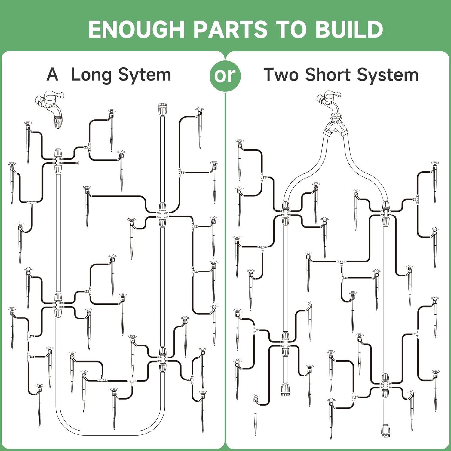 - Upgraded Main Tubing: Designed to withstand high water pressure, our enhanced 1/2" diameter main tubing ensures a reliable and constant water flow. Easily split the 40FT tubing to form two systems, each with its own faucet connector for dual setup convenience.