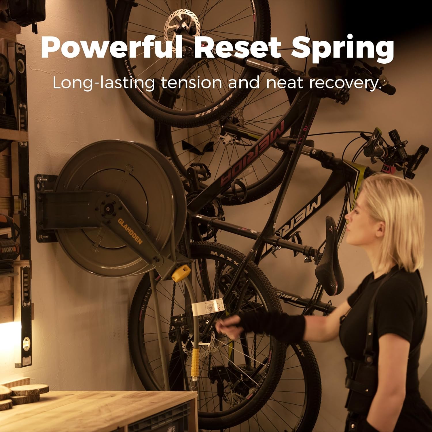 - Strong and Tangle-free Retraction: GLAHODEN retractable air reel uses a more powerful retracting spring, which maintains good tension even though it has been released recurrently 10,000 times. Self-leveling system winds the hose evenly, neatly and tangle-free, so that you say goodbye to "messy" workplaces from now on.