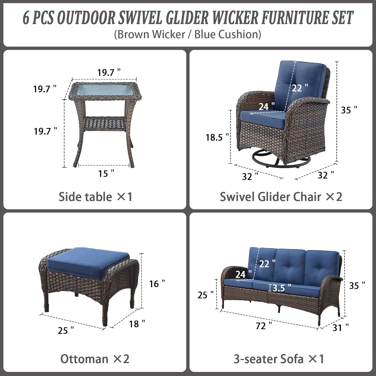 - 1.PATIO CONVERSATION SETS DETAILS: The 6 pcs patio furniture set includes 2 wicker swivel rocker chairs, 1 outdoor couch, 2 ottomans and 1 glass top side table, each chair has a weight capacity of 300 pounds and the side table has a weight capacity of 50 pounds. The brown color wicker with blue cushions in a simple and premium tone is perfect for decorating your patio, porch, balcony, sunroom and other outdoor spaces.