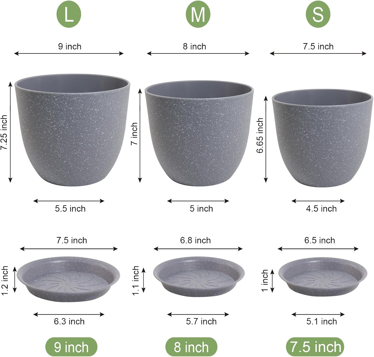 Flower Pots 9/8/7.5inch, Set of 3 Modern Decorative Plastic Planters with Drainage Holes and Saucers for Garden House Plants, Plant Pots for Indoor Outdoor Plants, Speckled Grey