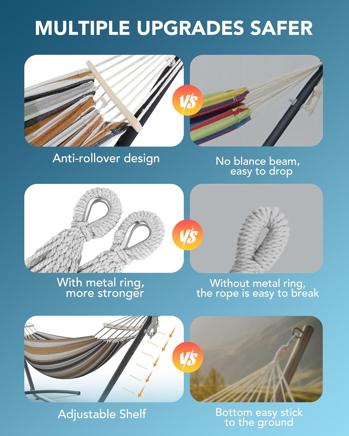 - DOUBLE HAMMOCK: It has a stronger and durable steel stand and a hook with a metal buckle. 450-pound weight capacity easily accommodates up to two people at once