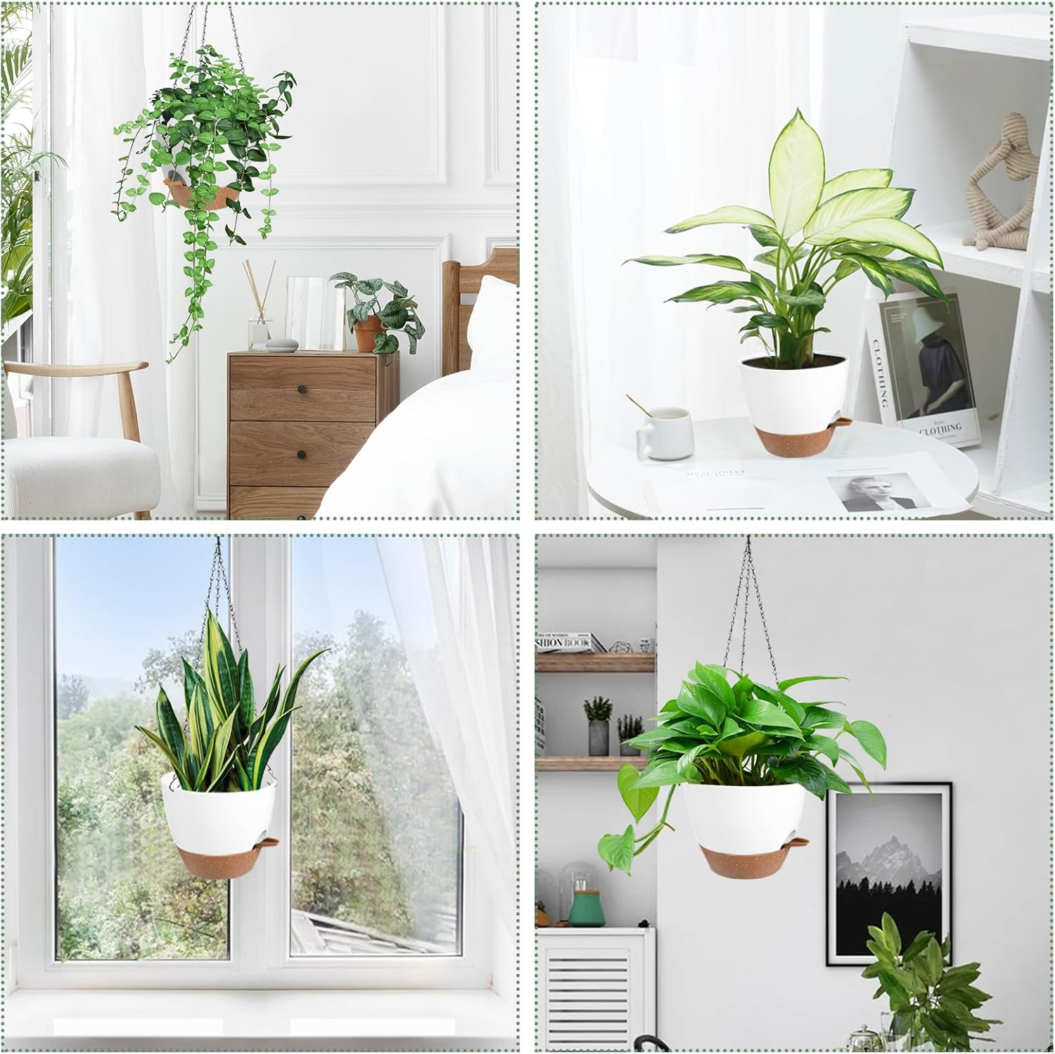 - Self Watering Planters Unique Style Design - The appearance and structural design of the self watering hanging planters for indoor plants are conducive to plant growth, and are suitable for matching various hanging plants. Such as ivy, herbs, ferns, philodendrons, succulents, flowers or other plants. Please Note: Plants NOT included.