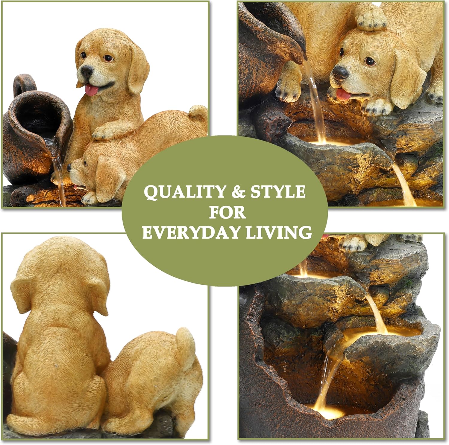 - Charming Rustic Design:This charming water fountain outdoor features two curious puppies exploring a cascading rustic pot and rock waterfall, adding a heartwarming touch to any outdoor or indoor space.