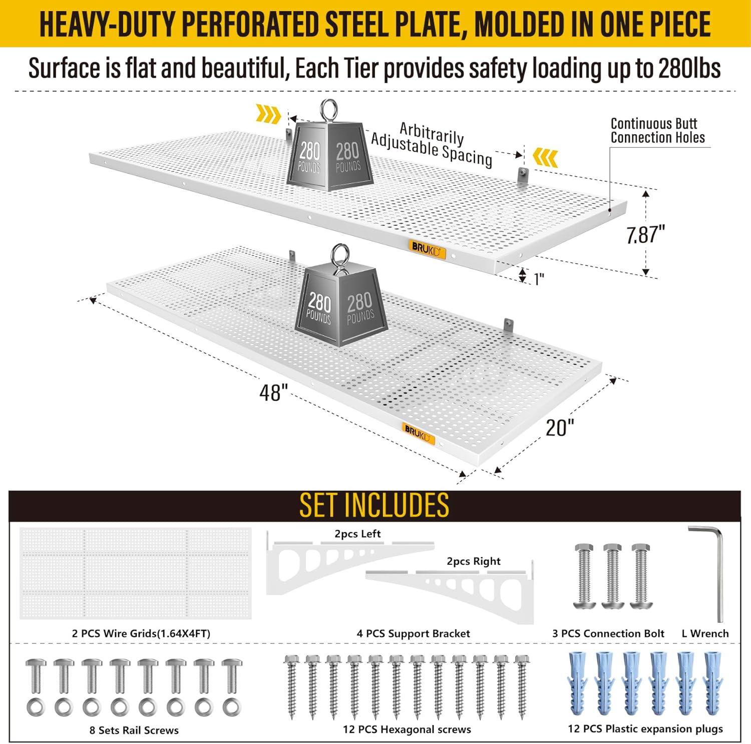- SUPERIOR DESIGN: Wall shelf garage storage rack panel is made of whole piece of perforated steel plate bending and welding, the surface of matte high temperature powder baking paint, flat and smooth; the panel adopts slide rail design, can be adjusted by parallel left and right sliding at will; bracket can be freely installed in 45” range of the spacing of the wood wall keel, without affecting the precision connection with the panel, eliminating the worry of being unable to docking due to the mismatch of spacing points of load-bearing wood wall keel or inaccuracy of the installation of the bracket. It saves time and labor