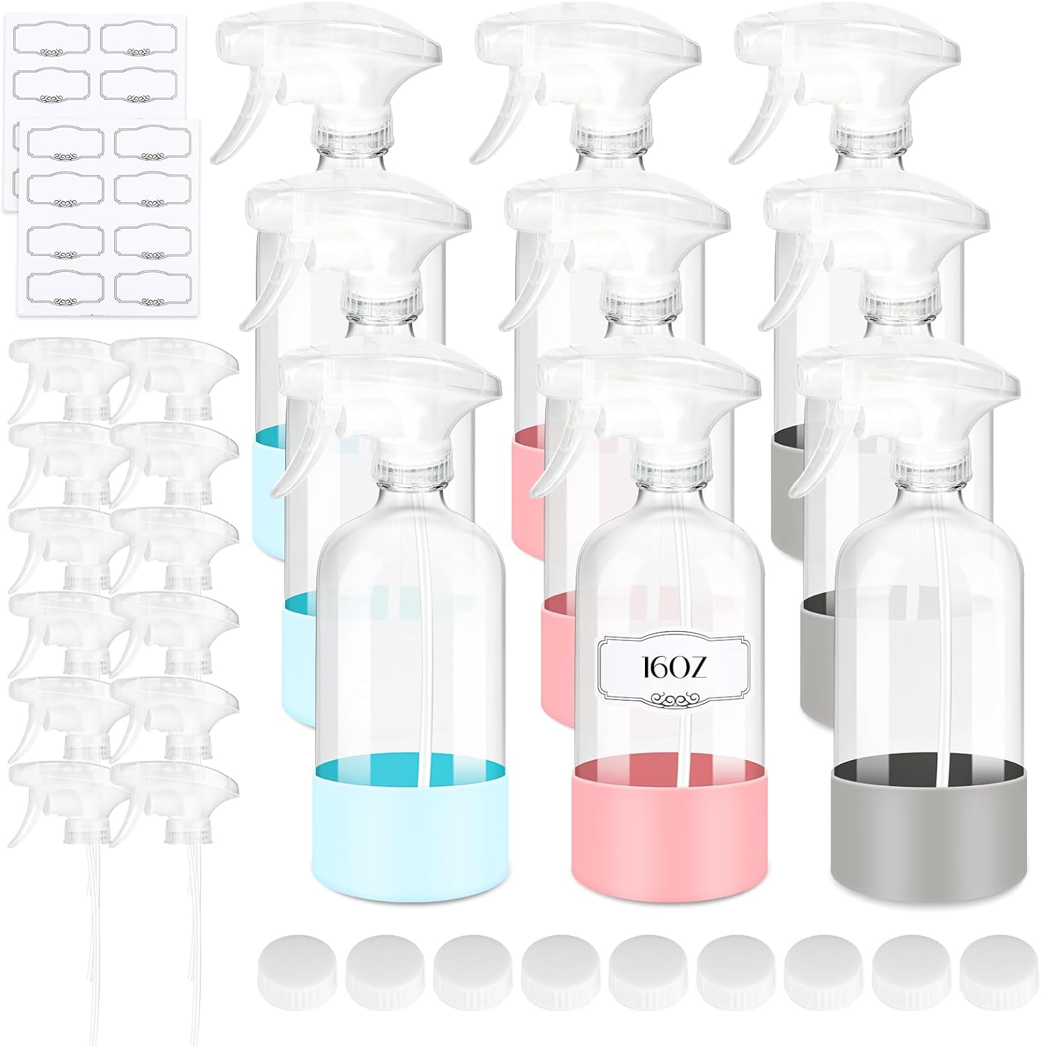9 PACK/16 OZ Glass Spray Bottles with Upgraded Adjustable Spray Nozzle, Refillable Containers with Silicone Sleeve, Spray Bottle for Hair&Cleaning Solutions&Essential Oils-Pink Blue Gray