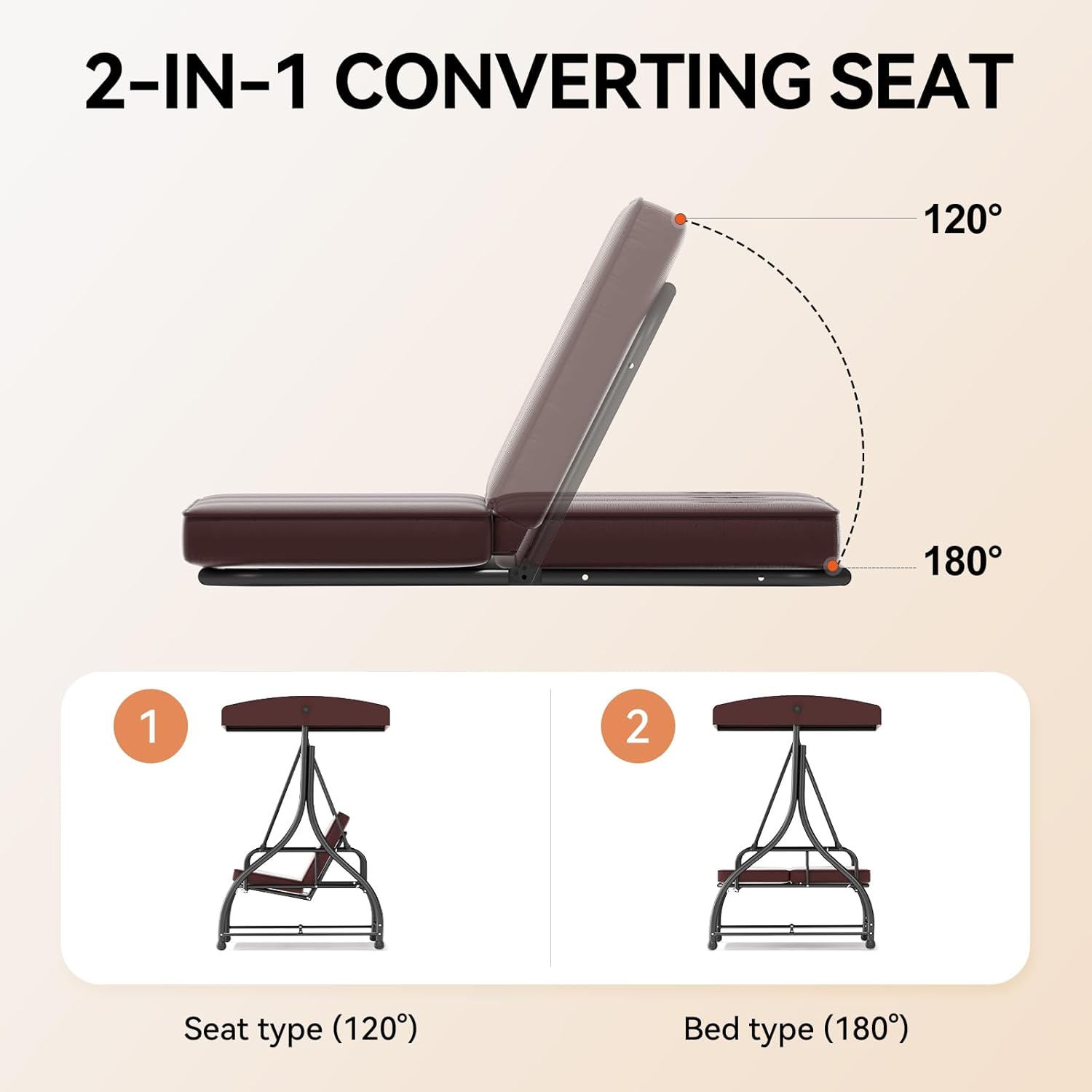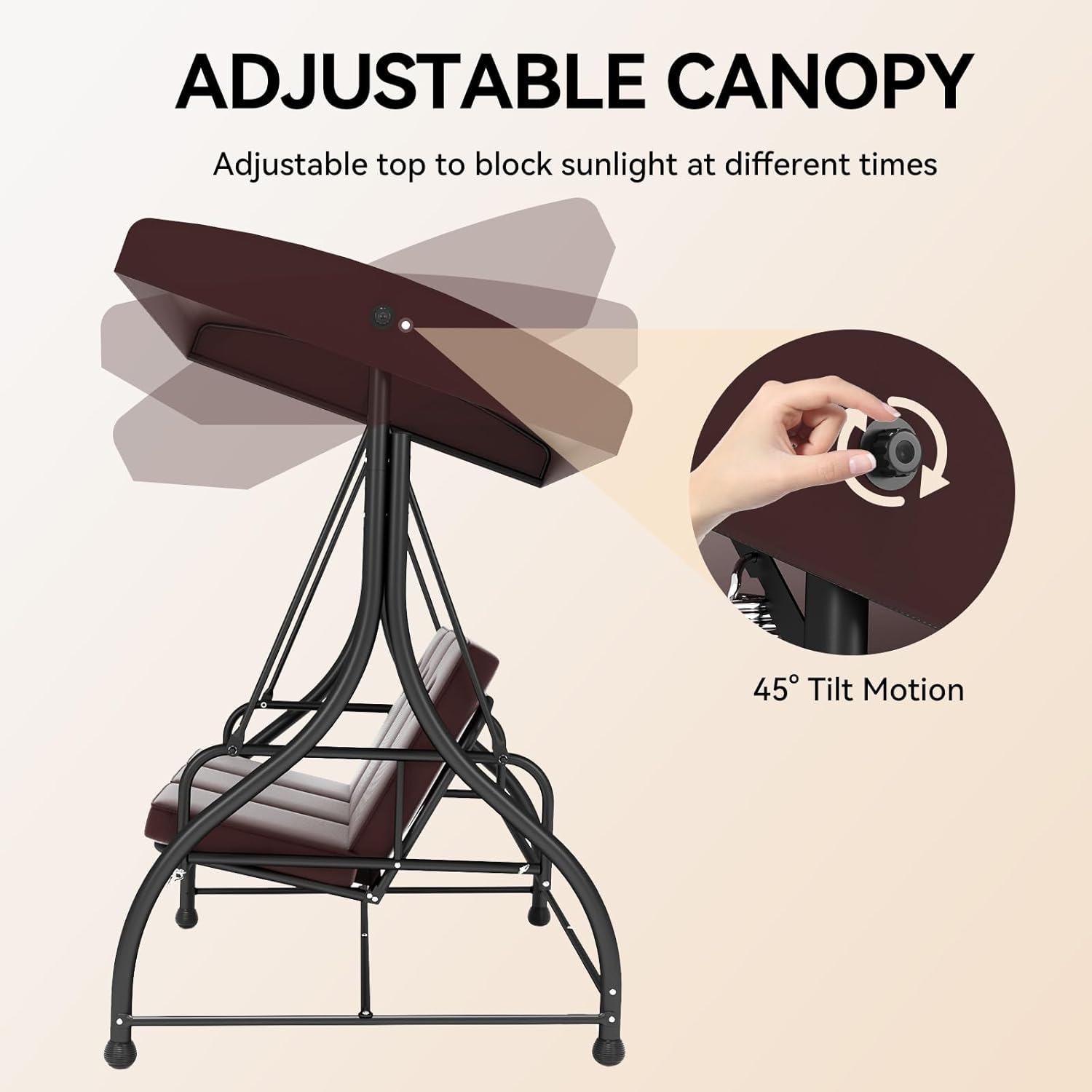 3-Seat Outdoor Patio Swing Glider - Heavy Duty Steel Frame with Adjustable Canopy & Removable Cushions - All Weather Porch Swings Chair for Backyard, Garden, Poolside - Brown