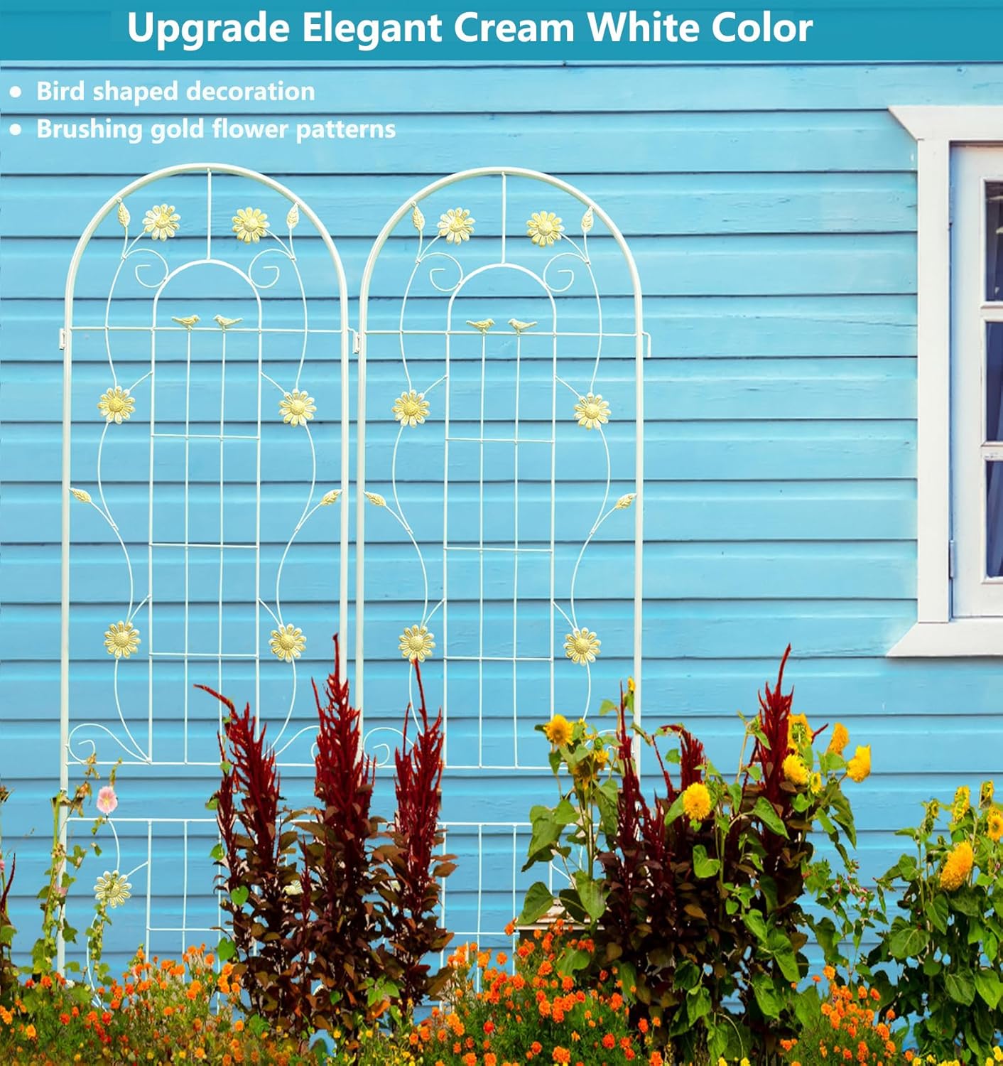 - Plants Supporting Trellis: This White metal garden trellis is perfect for supporting all kinds of flowering trellis plants, wall-climbing vines. It allows them to grow naturally up towards the top.