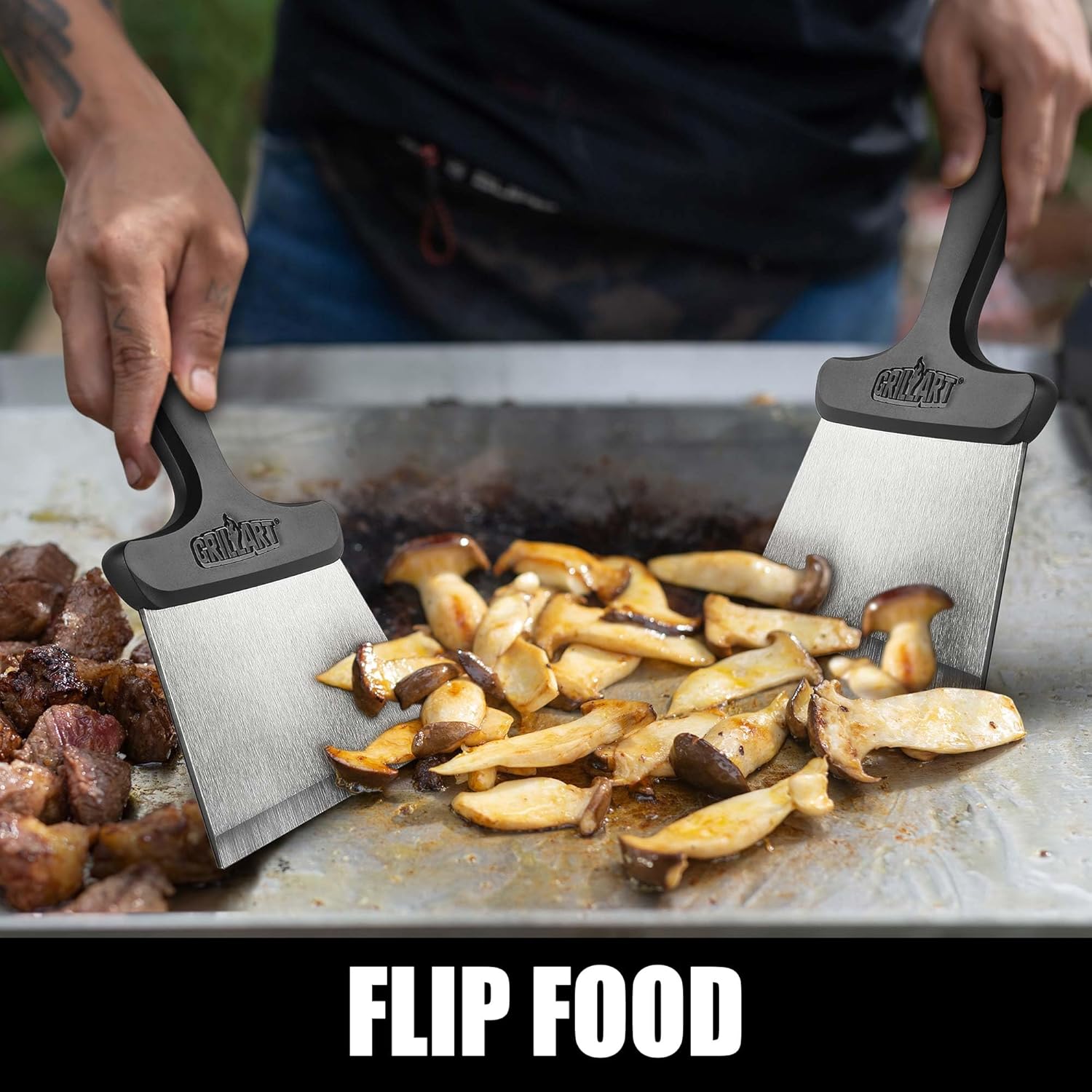 - 3-in-1 Grill Tool】Not just a scraper! Use it to clean griddle/grates, chop foods while cooking, or flip burgers and veggies—all with one versatile tool.