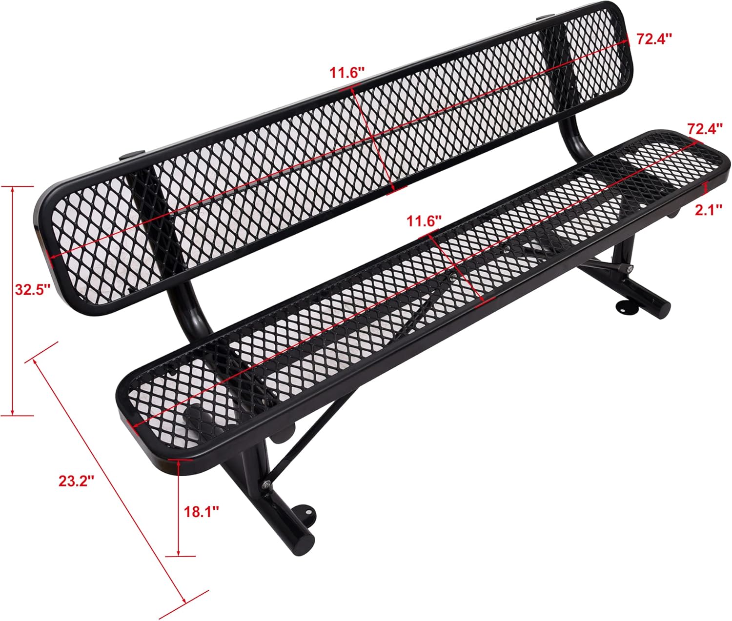6 FT Heavy Duty Park Bench, Outdoor Metal Black Bench with Back-Commercial Steel Benches for Outside, 2-4 Person Seat-Garden Benches with Portable Frame for Outdoors