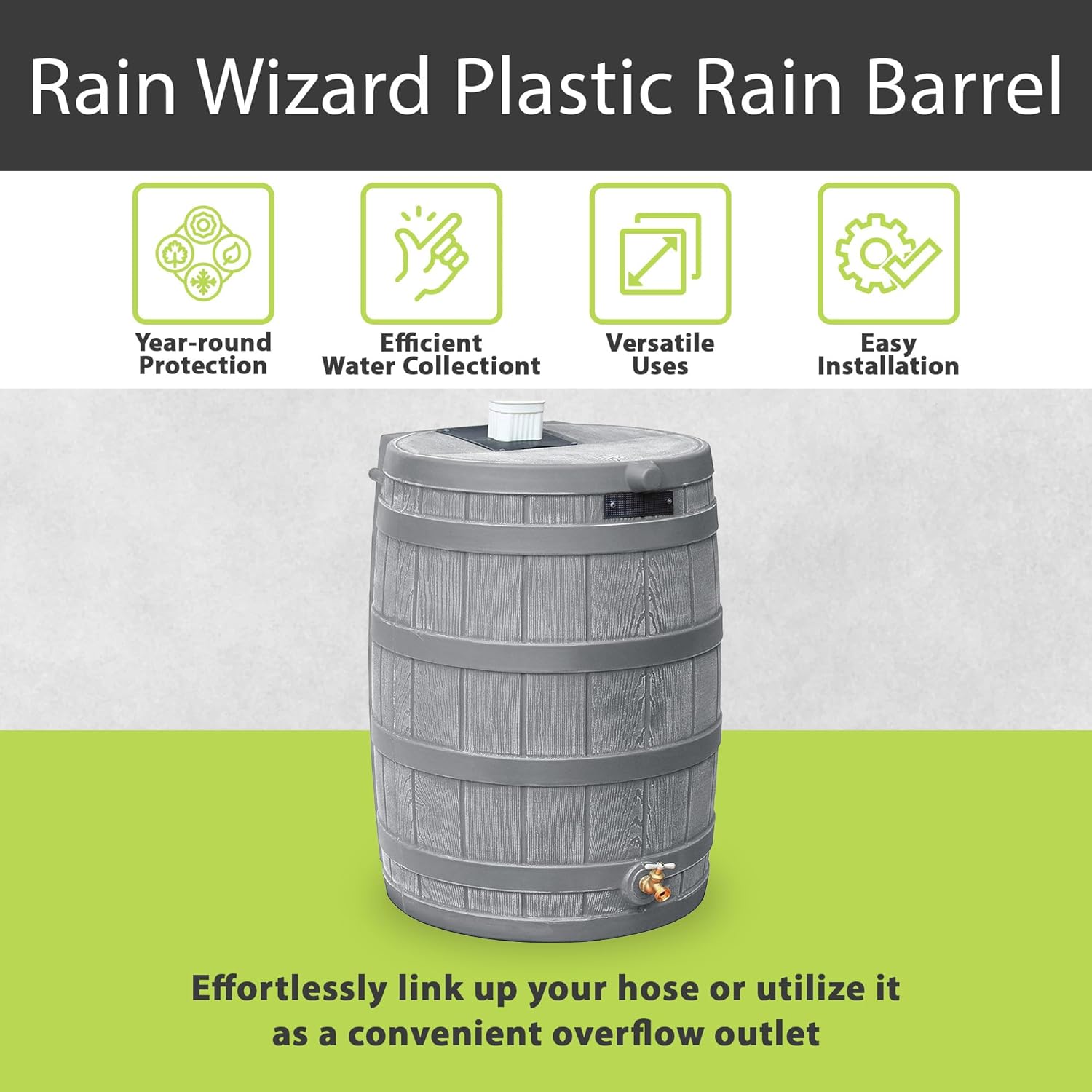 Good Ideas Rain Wizard 50 Gallon Plastic Outdoor Home Water Storage Tank Rain Barrel Collector with Brass Spigot and Flat Back Design, Gray