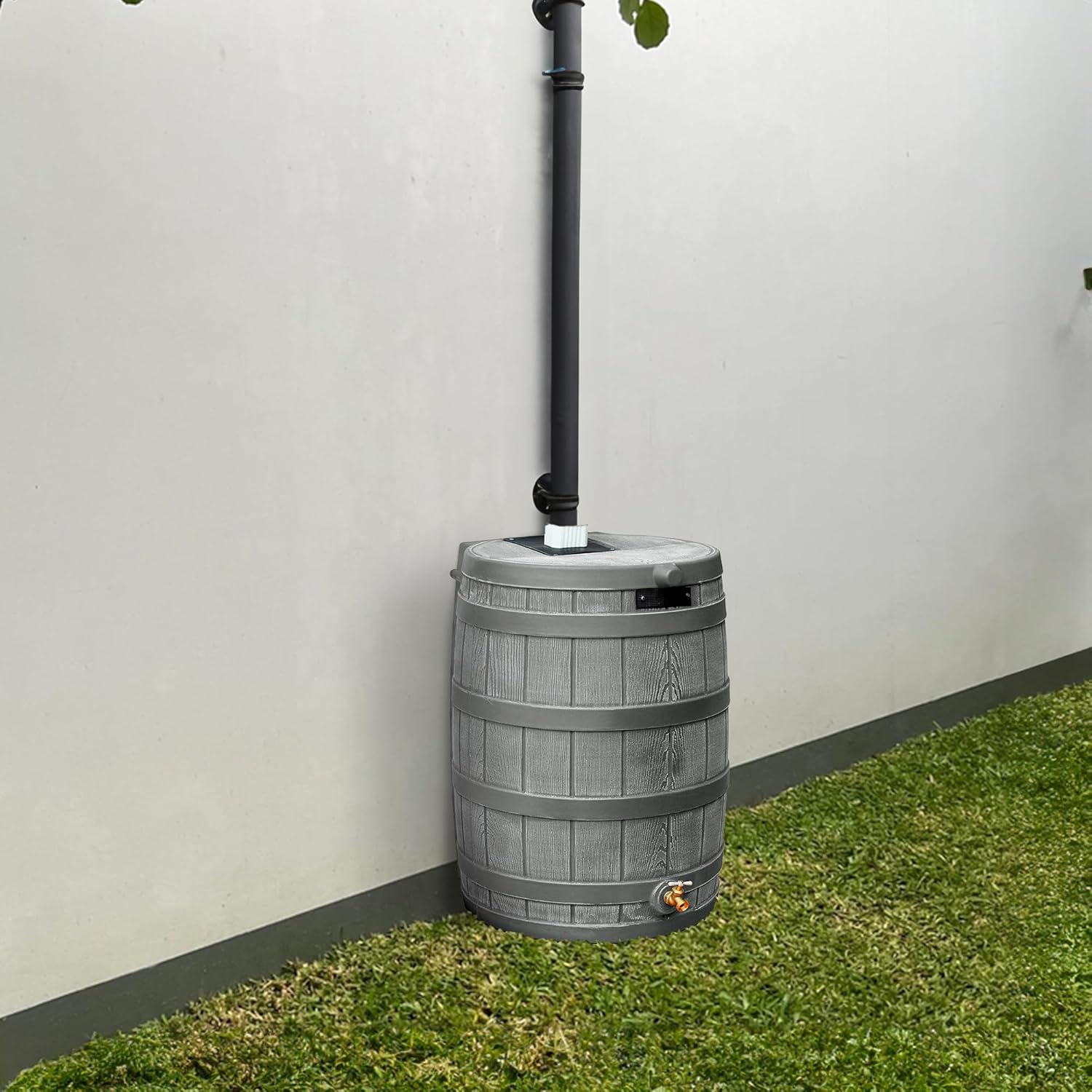 - Sleek Rain Barrel: Harness the power of nature with this sleek gray faux wood rain barrel, designed to capture and conserve rainwater; Complete with a brass spigot, effortlessly link up your hose or utilize it as a convenient overflow outlet