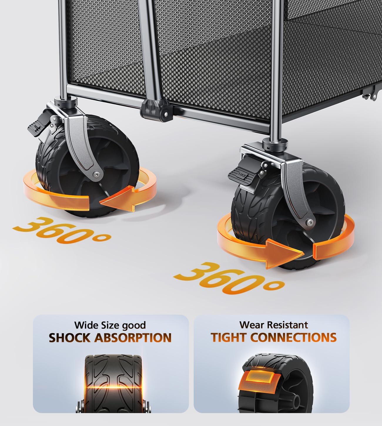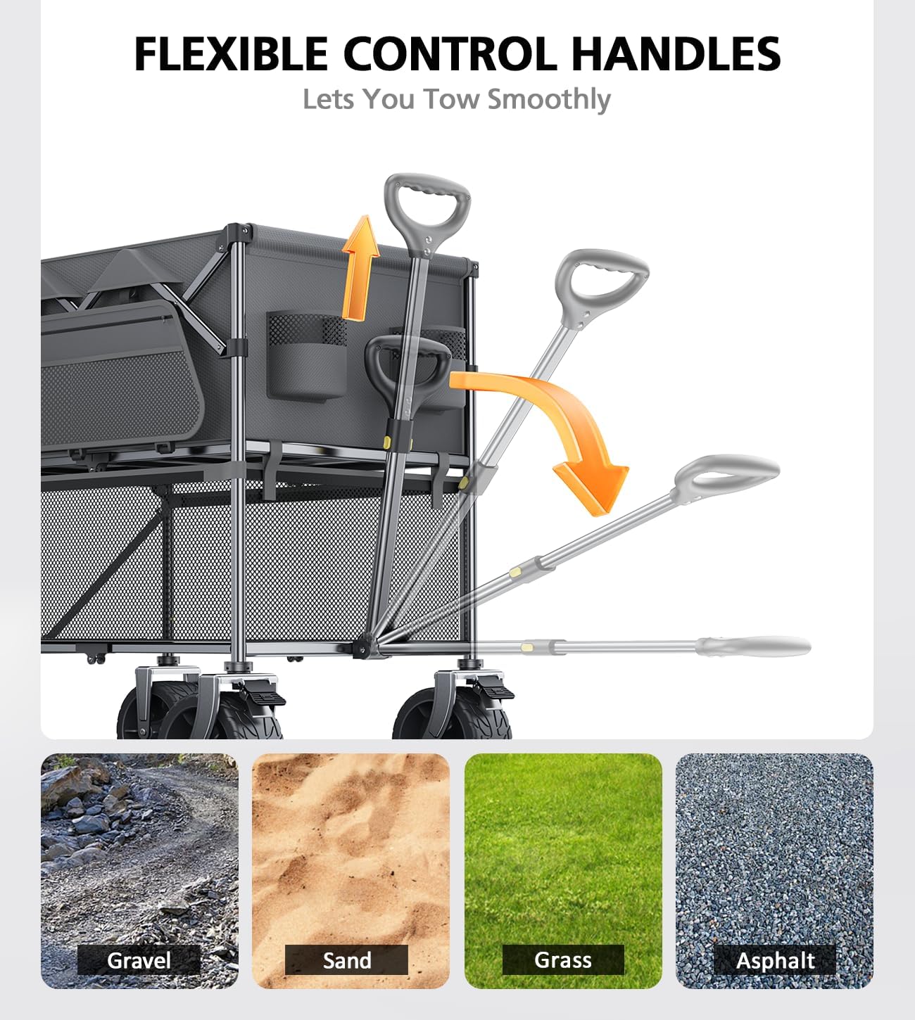 - All-terrain Off-road Carts Wheels. The premium beach carts with wheels for all ground are strong abrasion resistance, silent shock absorber, wear-proof, no drag marks. It can walk all terrains- concrete, grass, rock, mud. Handles like a dream on hills too.