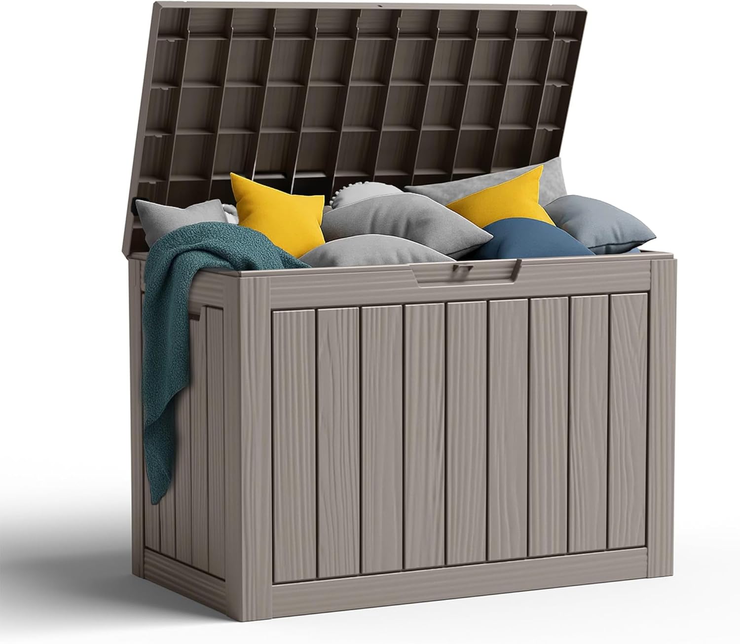 - VERSATILE IN EVERY SETTING: This patio storage box doubles as an indoor laundry organizer and an outdoor yard storage unit for cushions, garden tools, pool accessories, outdoor gear, and more, offering ample space. It can also serve as a side table, patio seat, storage bench, or footstool