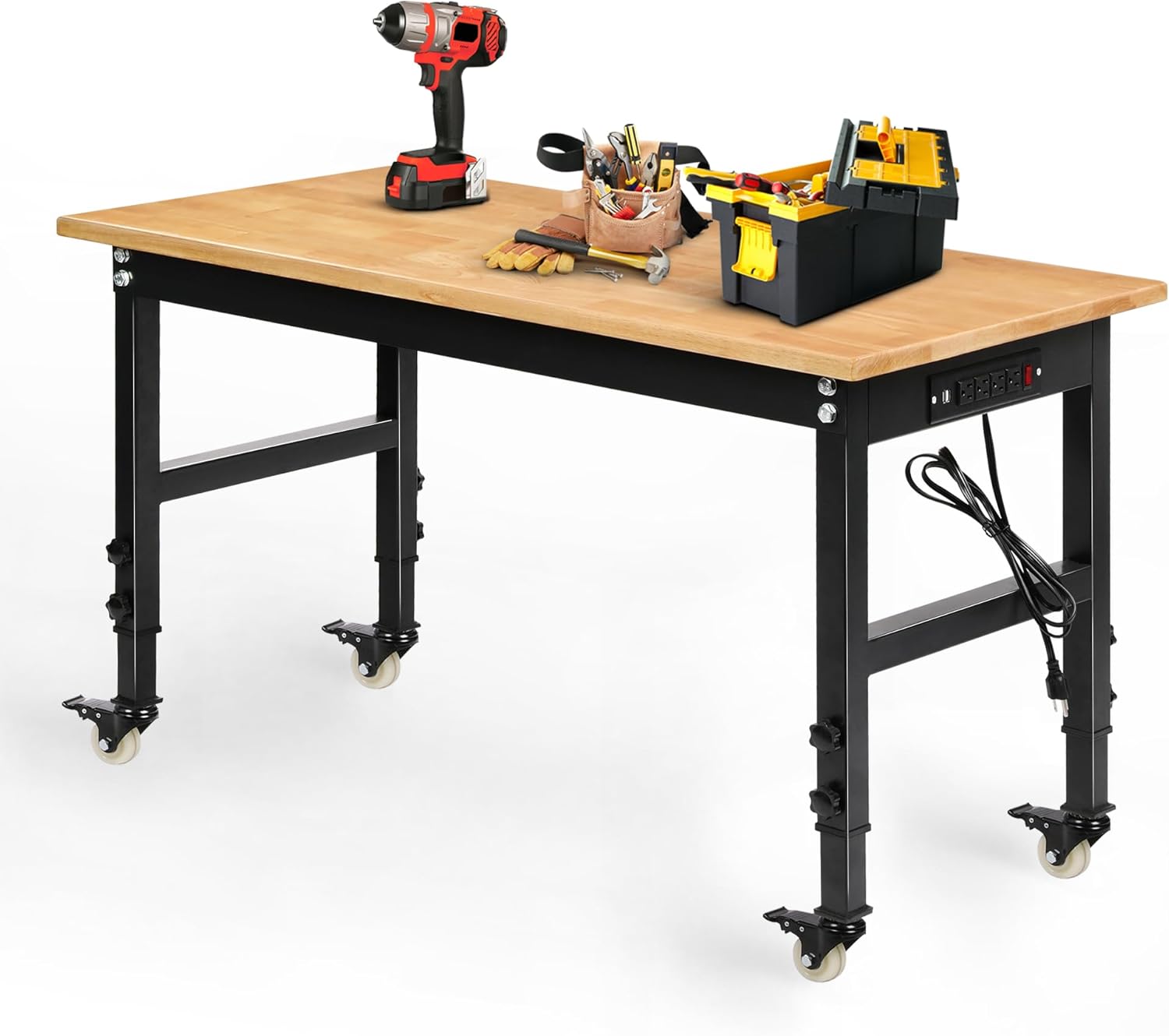 48" Adjustable Workbench for Garage, Rubber Wood Heavy Duty Workstation with Power Outlets & Wheels, 2000 LBS Load Capacity Hardwood Worktable for Workshop, Garage, Office, Home, Commercial