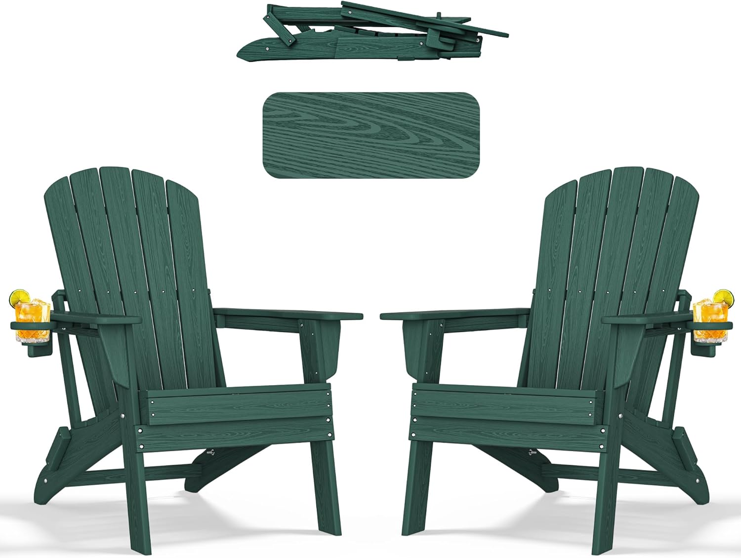 Folding Adirondack Chair - Extended Ergonomic Backrest, Cup Holder - Easy Assembly - Durable HDPE Plastic, Weather Resistant & Maintenance-Free - Lawn, Patio, Deck Supports 380lbs Green