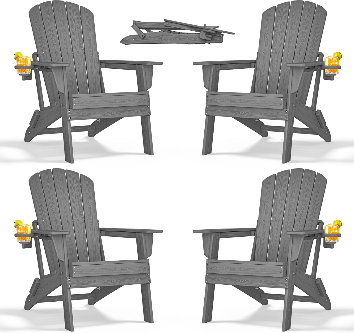 Folding Adirondack Chair - Extended Ergonomic Backrest, Cup Holder - Easy Assembly - Durable HDPE Plastic, Weather Resistant & Maintenance-Free - Lawn, Patio, Deck Supports 380lbs Grey